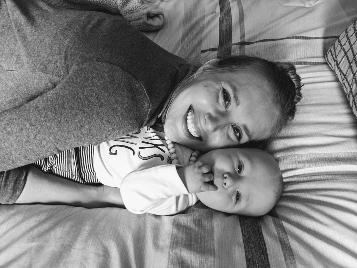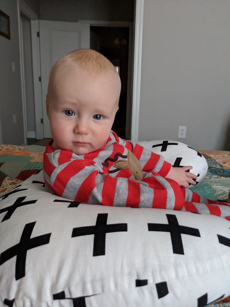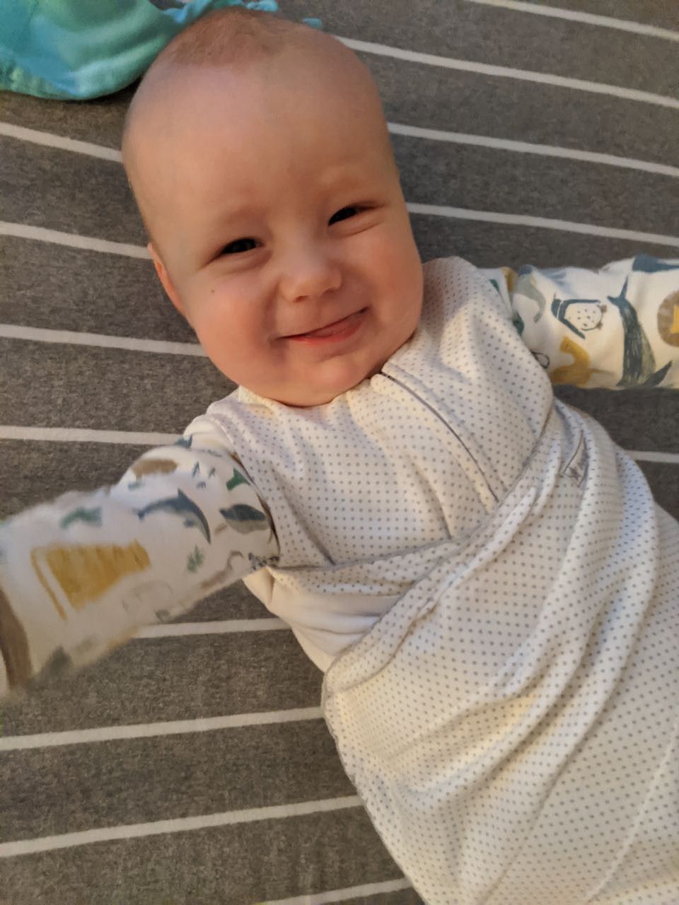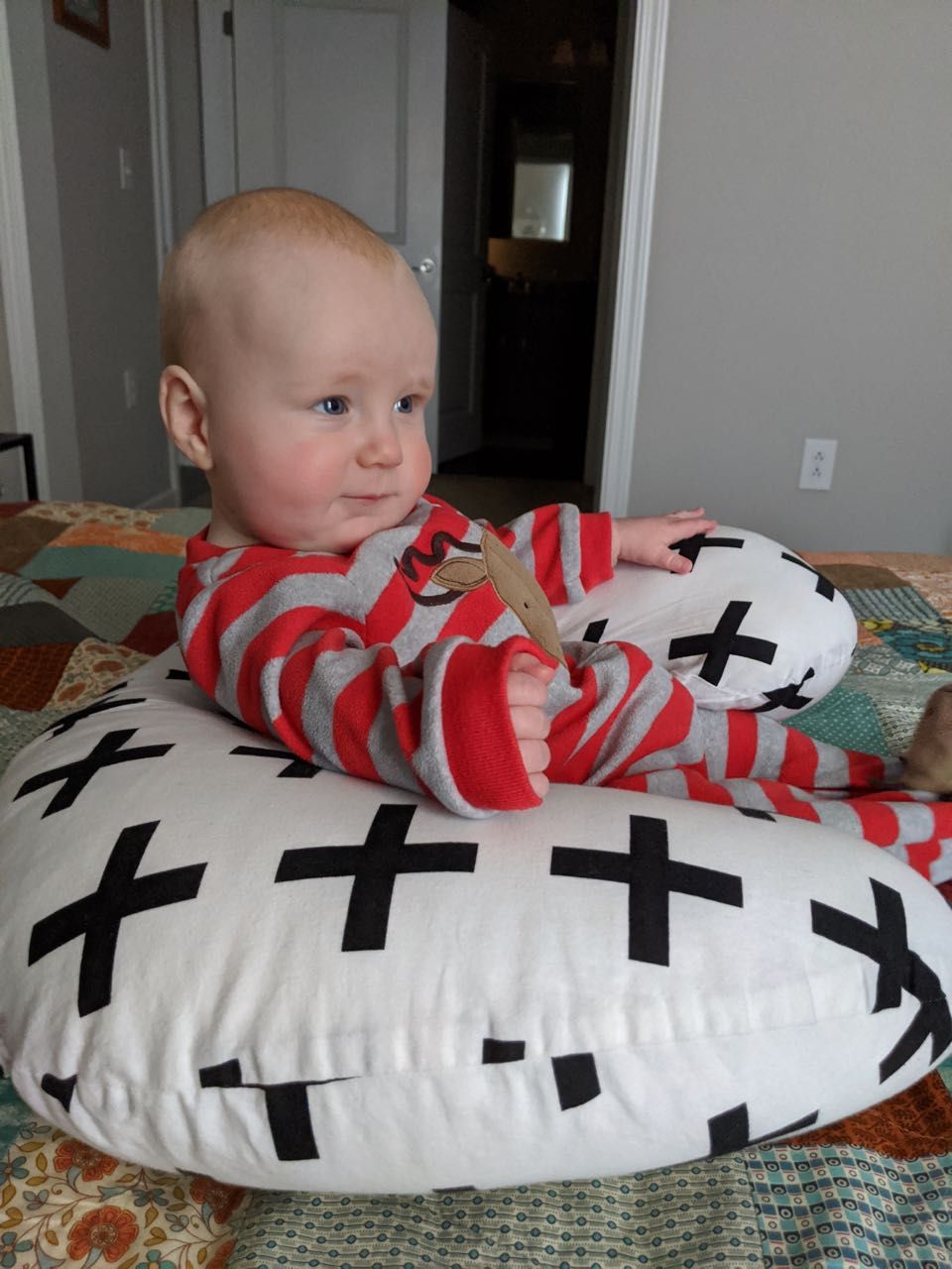 Someone practicing sitting up (with assistance and supervision) and enjoying it.