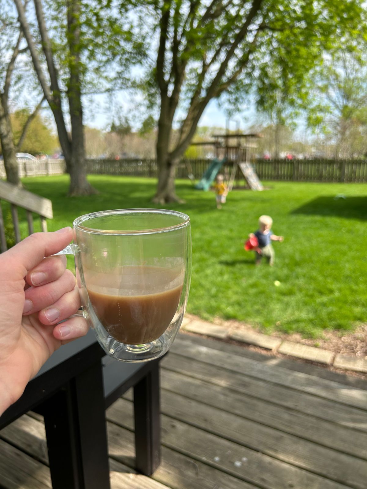 - Playing more in the backyard. Both boys want to be outside as much as possible (which is wonderful!) I've been able to enjoy coffee and sometimes a little knitting on the back deck, especially now that we have a patio table.