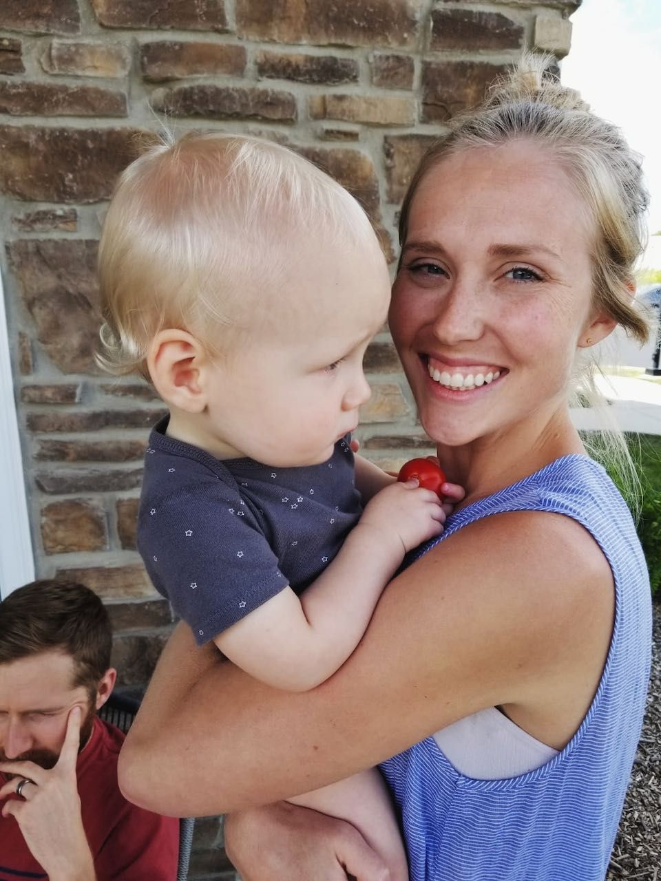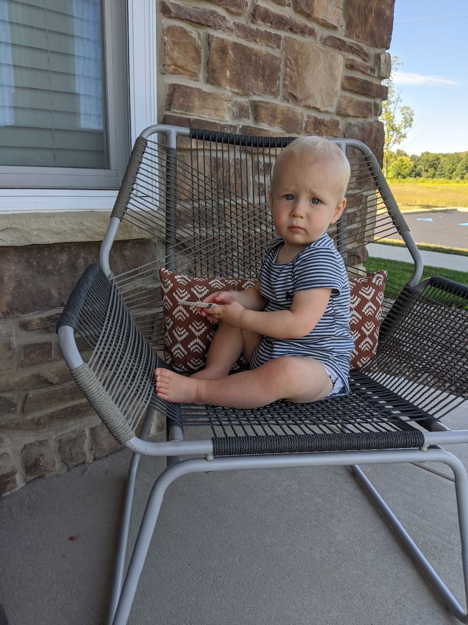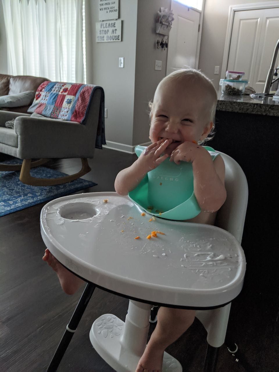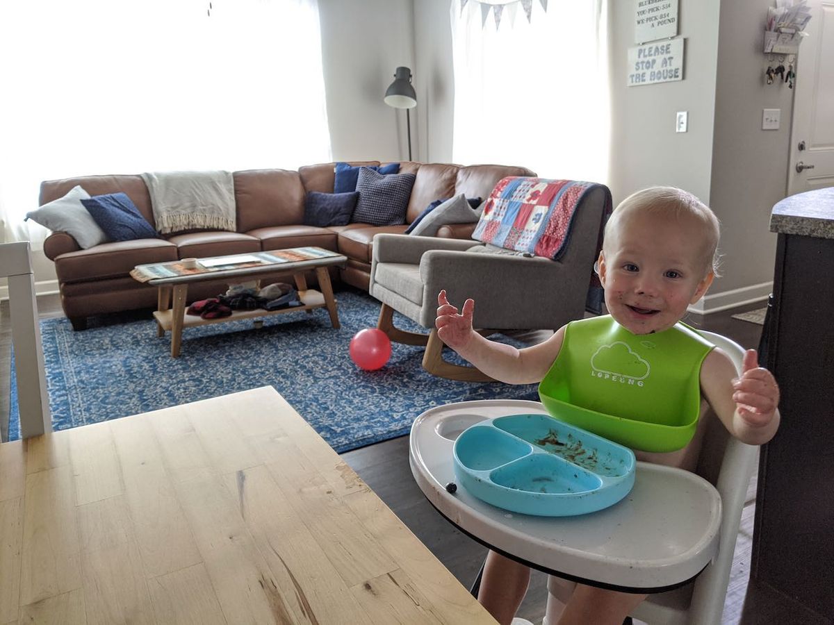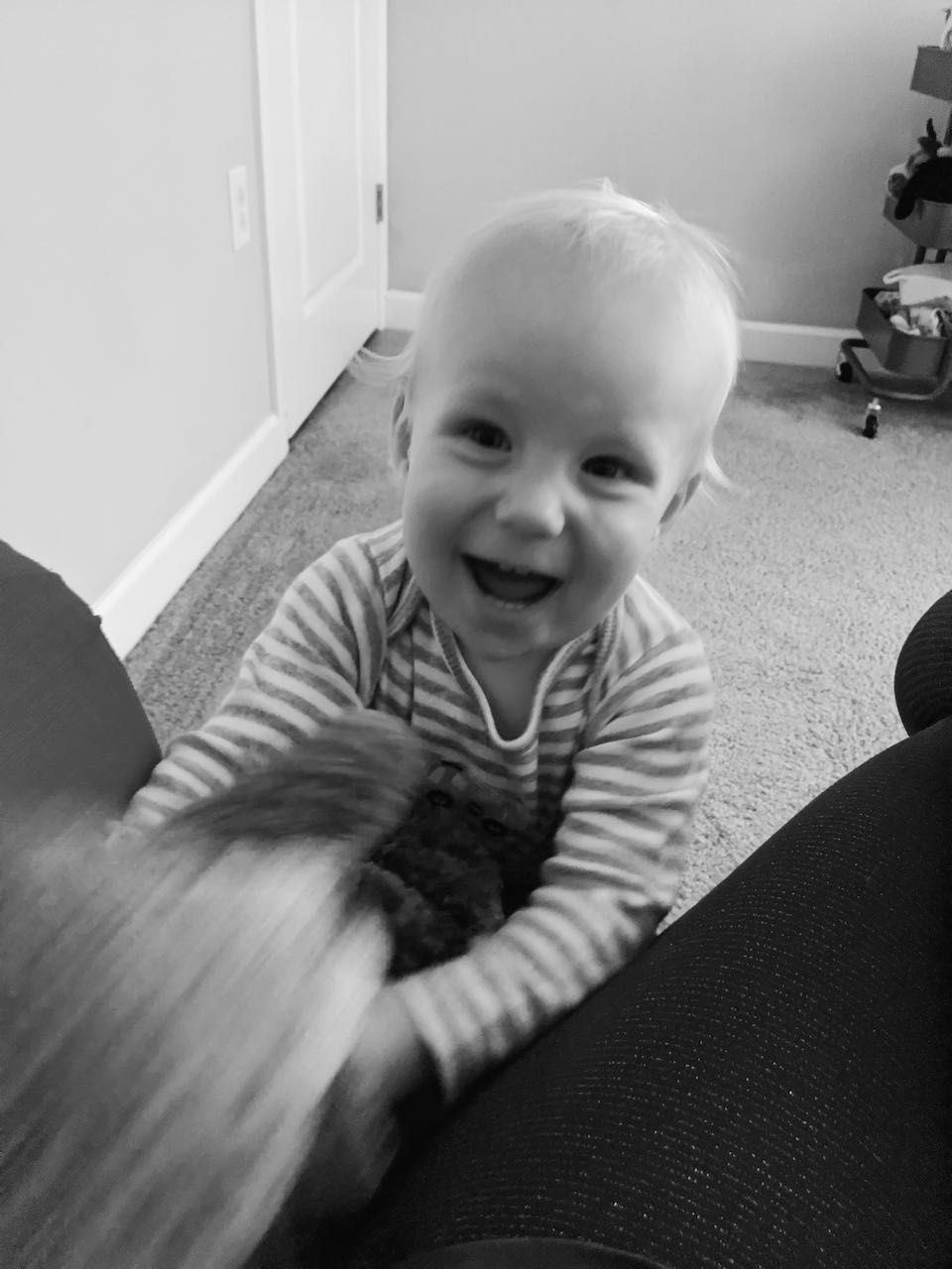 A little boy who loves sleeping with his little bunny, climbs up on patio furniture by himself, started up the scrunched-nose grin again, randomly cuddles and cozies up in comfortable spaces (laundry piles, couch pillows, etc), and literally screams in delight in his highchair sometimes.