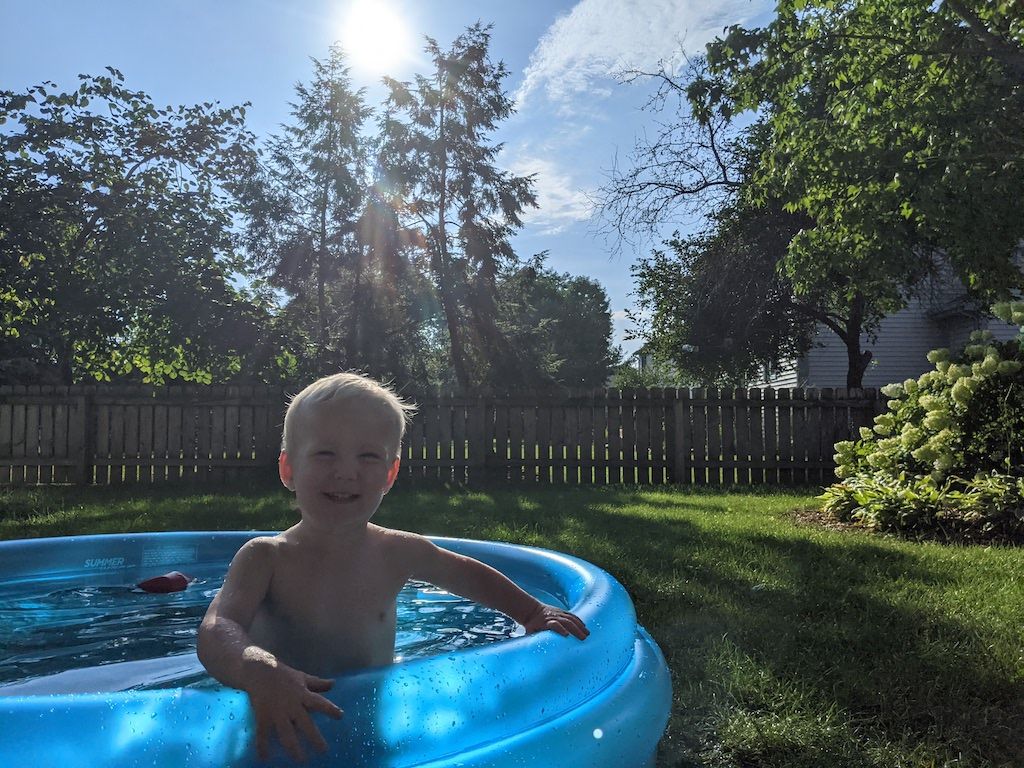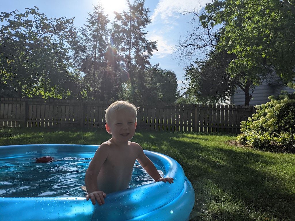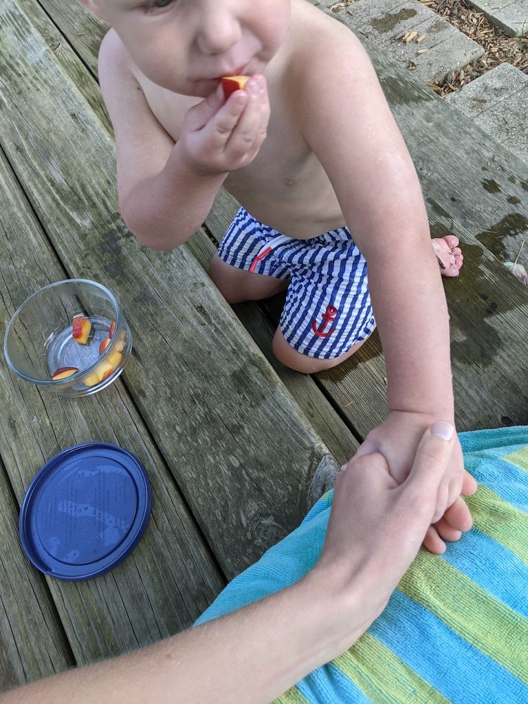 A little snacker, holding my hand while he eats nectarines on the back deck after three (inflatable) pool days in a row.
