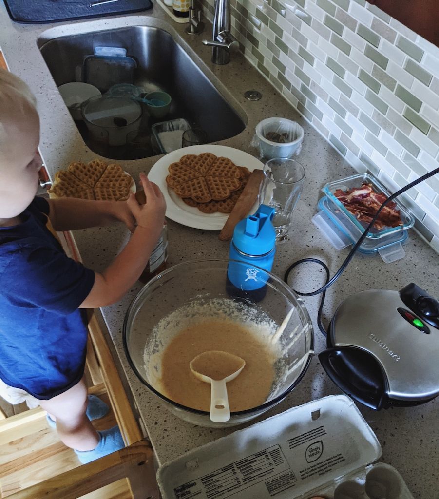 Making lots of messes in the kitchen. Messes stress me out more than I wish they did, but amid the chaos, I always remember, messes can be cleaned up, just one thing at a time. And the time I get with my little helper in the kitchen are some of my favorite moments with him. He loves stirring, whisking, transferring veggies, telling me when the waffle is done (green light), separating strips of bacon, and measuring and grinding coffee beans.