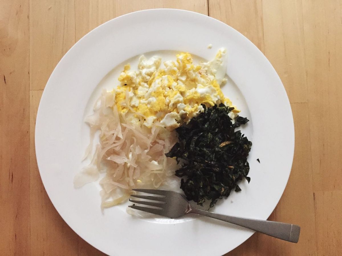 - breakfasting with scrambled eggs, sauerkraut and collard greens