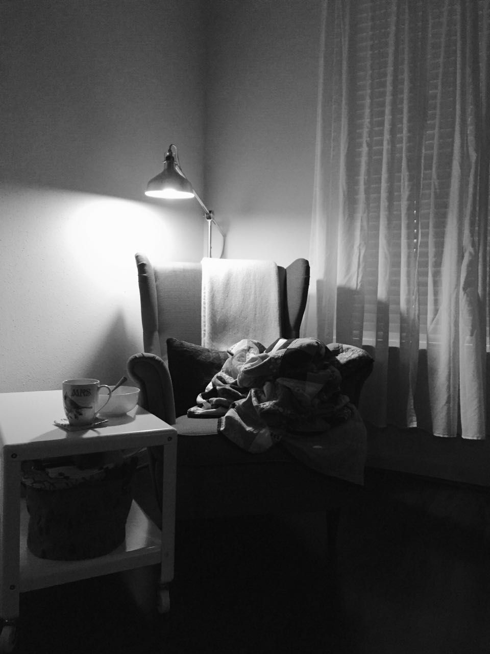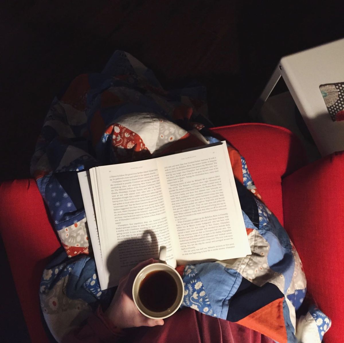 - nestling into my seasonal "reading nook" in the red chair. I never sit there and read in the warm months, but I love that spot for the purpose in fall and winter
