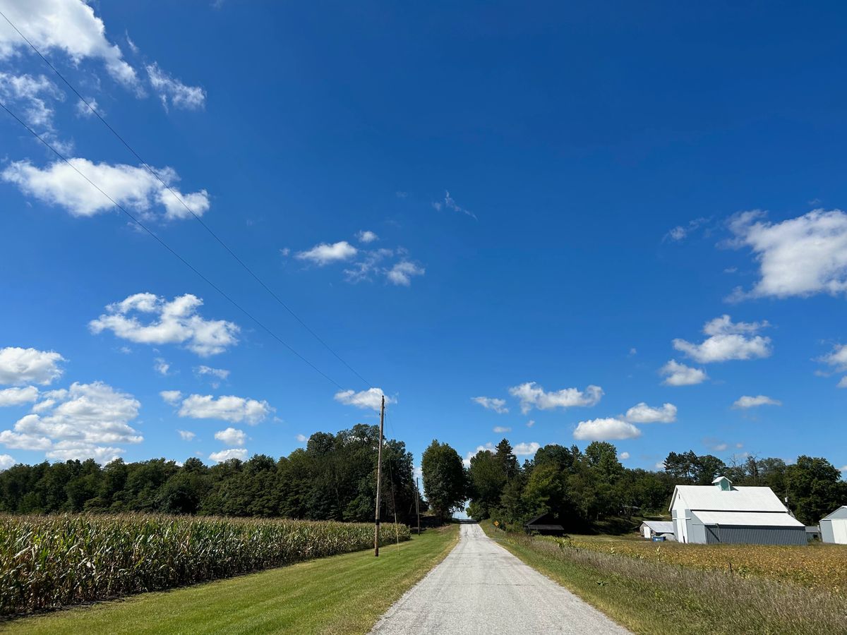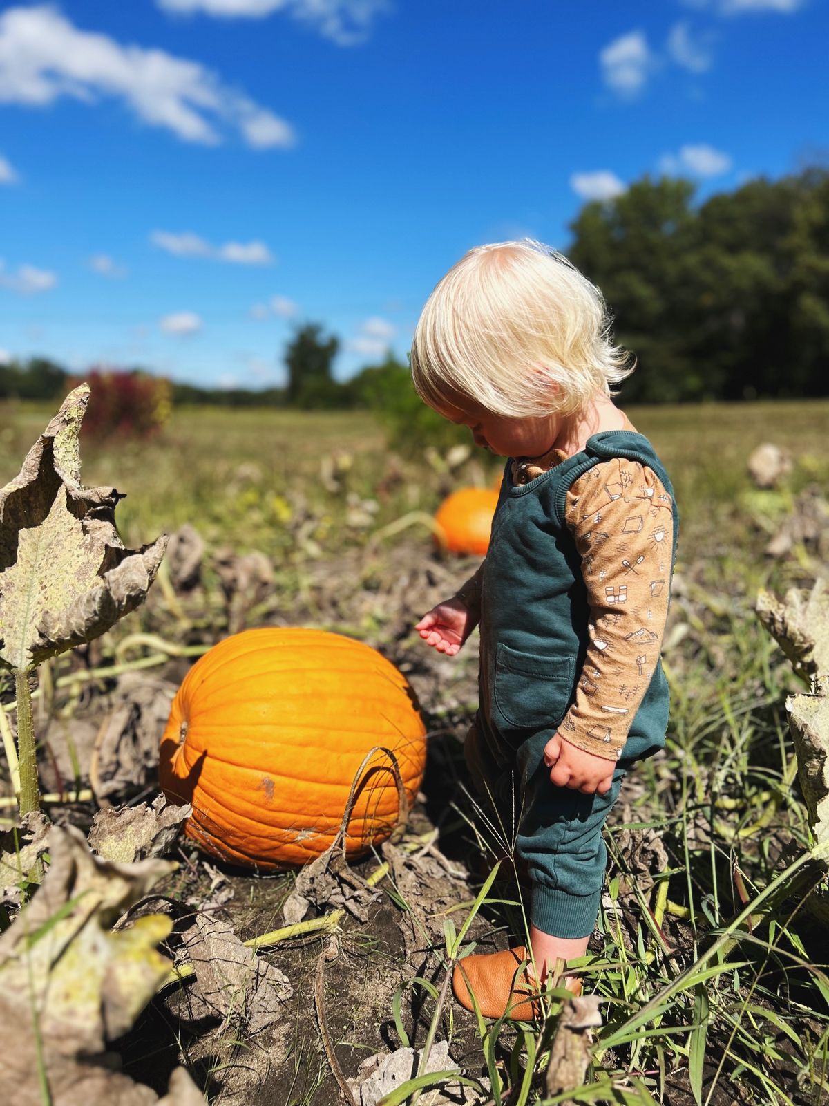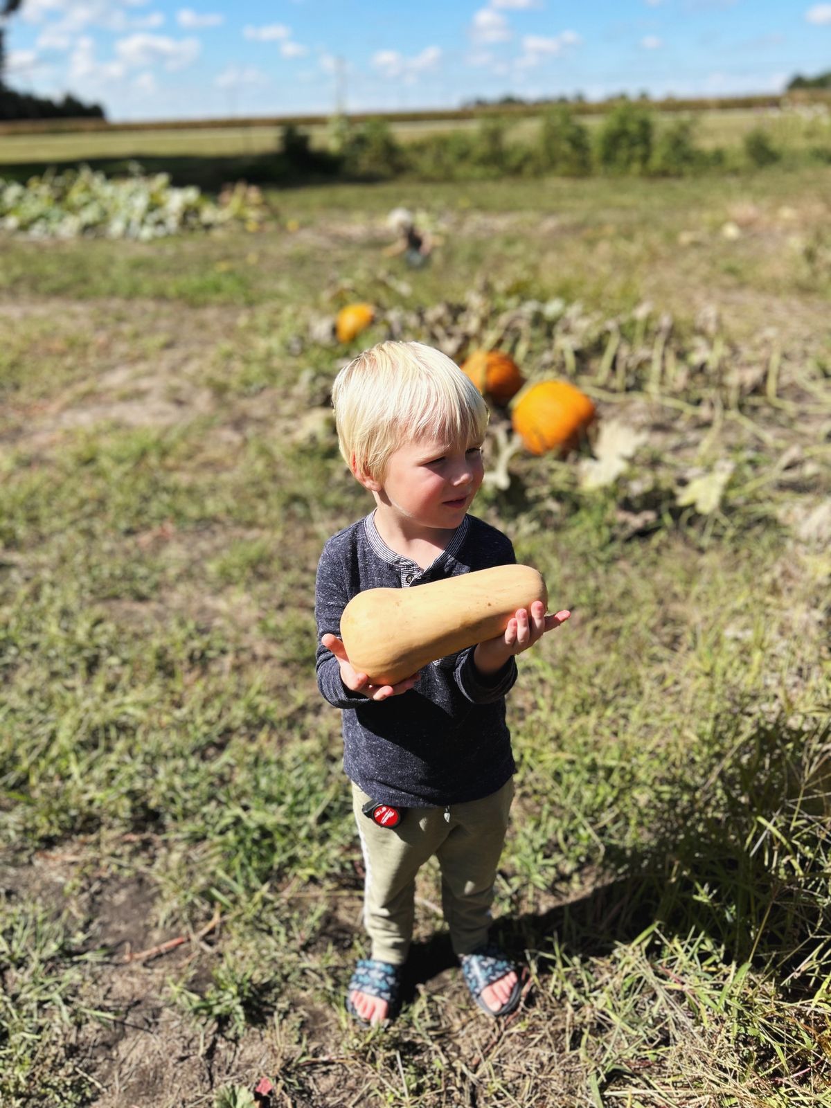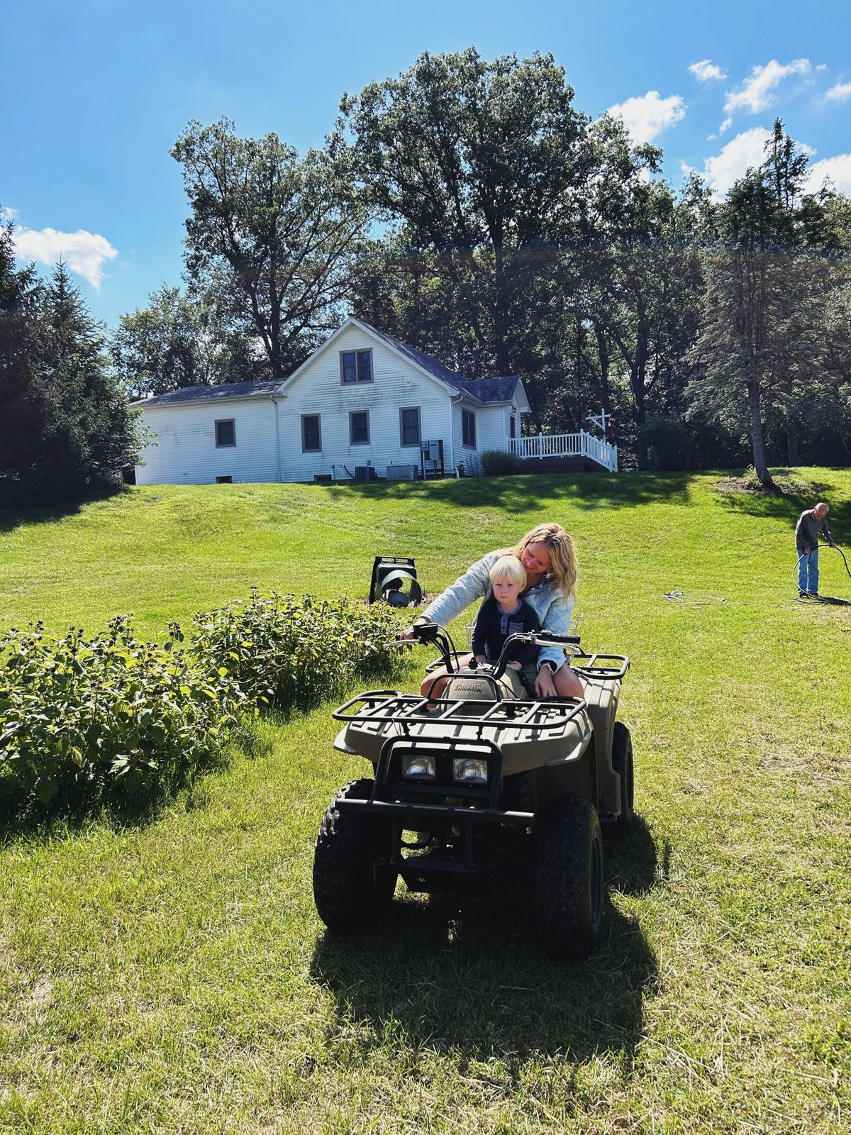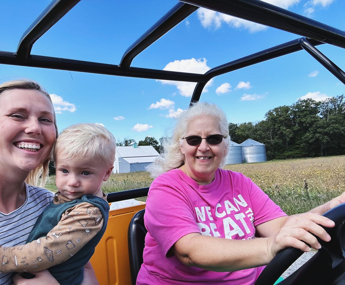 Visiting Great Grandpa's farm. We had coffee and treats and chatted, and also took the cub cadet (me, Finn, and Aunt Brenda) and the four wheeler (Katelyn and Cooper) down to the garden. We picked a big pumpkin, as well as green pepper and butternut squash and golden tomatoes to take home. Such a fun visit!