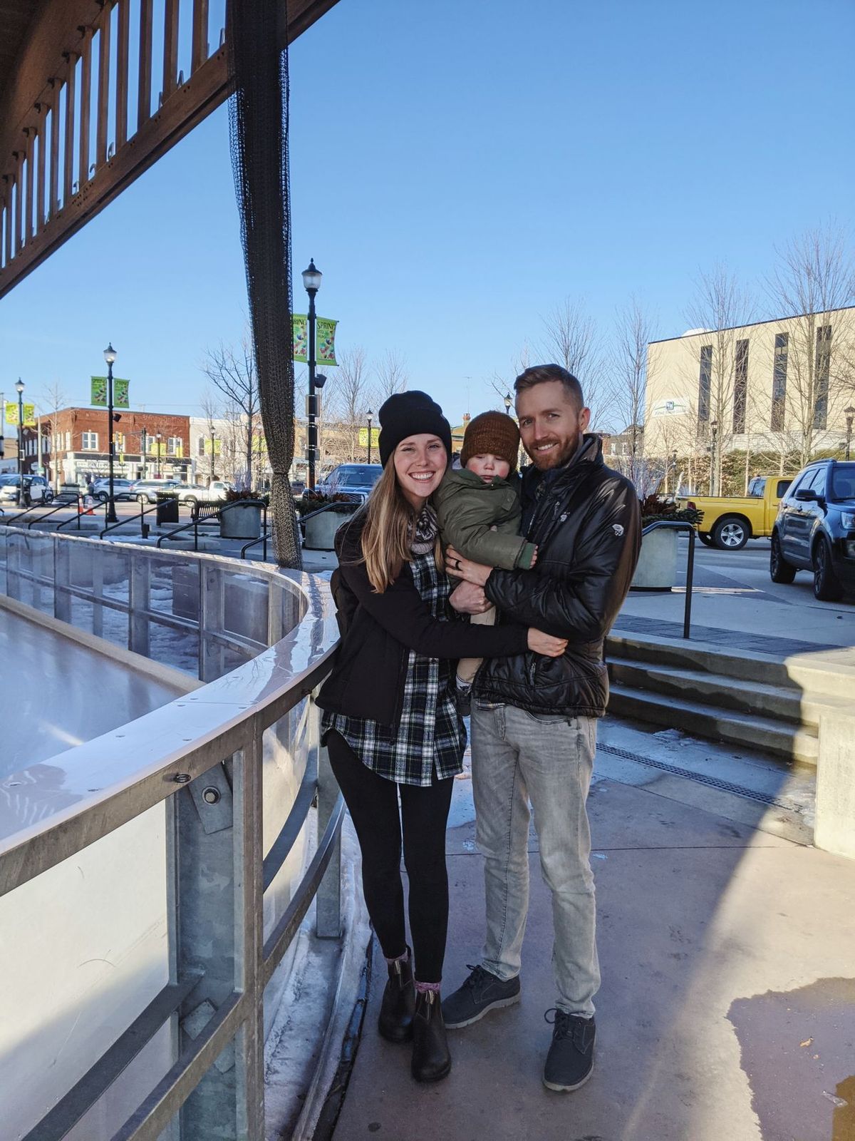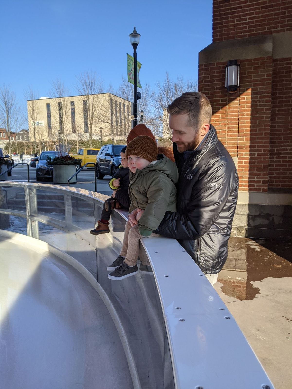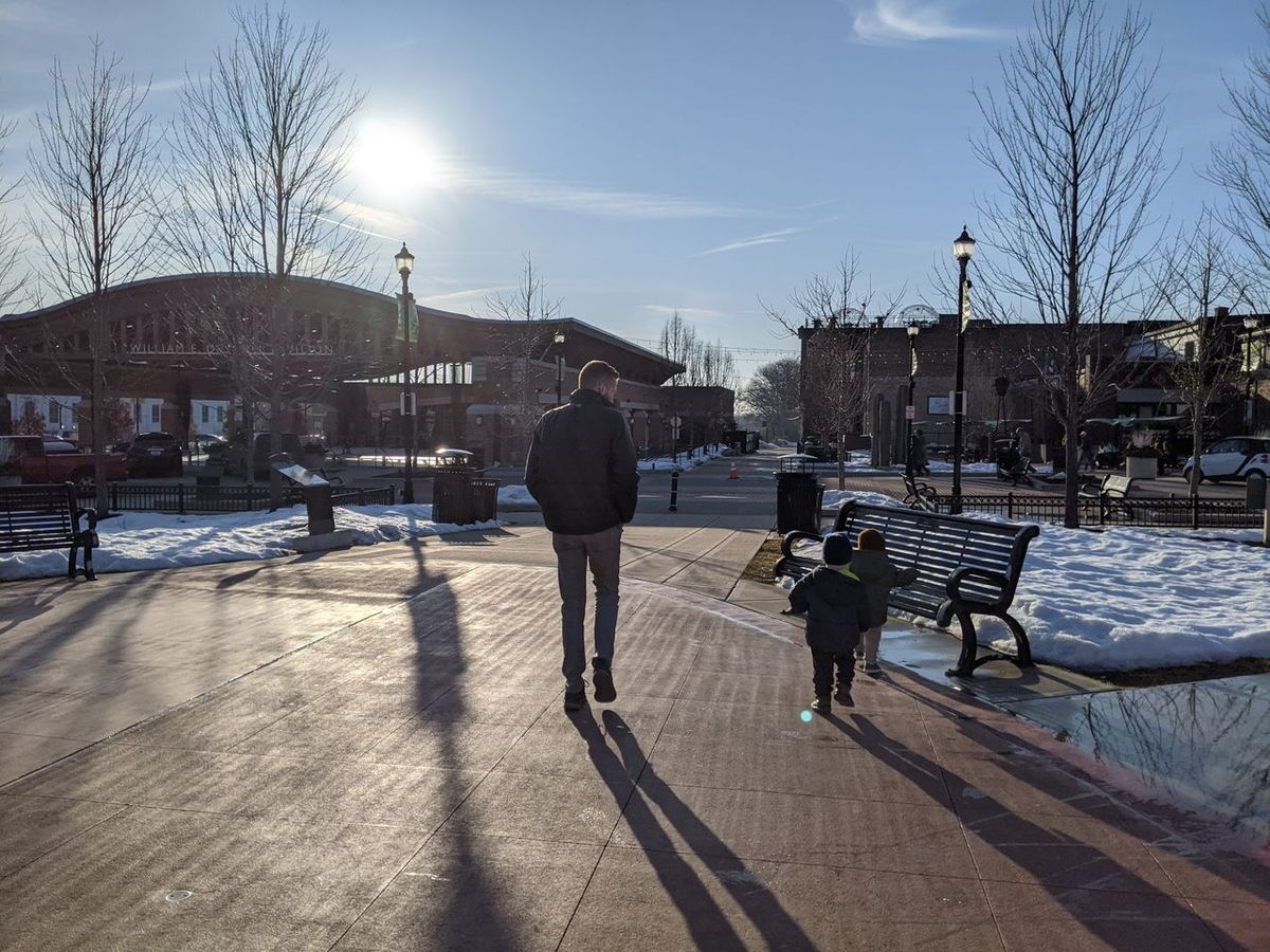 Saturday, we made eggs and bacon for breakfast, the boys played, Nicholas read to them, and we got out for a walk and time to play in the (melting) snow before lunch. While the boys napped, I knit on some slipper socks for Nicholas, Jessica read, we drank half-caf coffee and talked. After naps, we got everyone bundled up a bit, loaded in the truck, and then drove to our downtown so the boys could watch the ice skaters at the park. Lots of dancing to music, jumping in puddles, and inquisitiveness about the music coming from speakers. The sky was bright blue and the late afternoon sun warm, and it was the kind of weather that makes you nostalgic for warm days in the past and yearn for all the warm days ahead. Dinner was our favorite local BBQ that I had picked up earlier in the day, and some roasted asparagus.