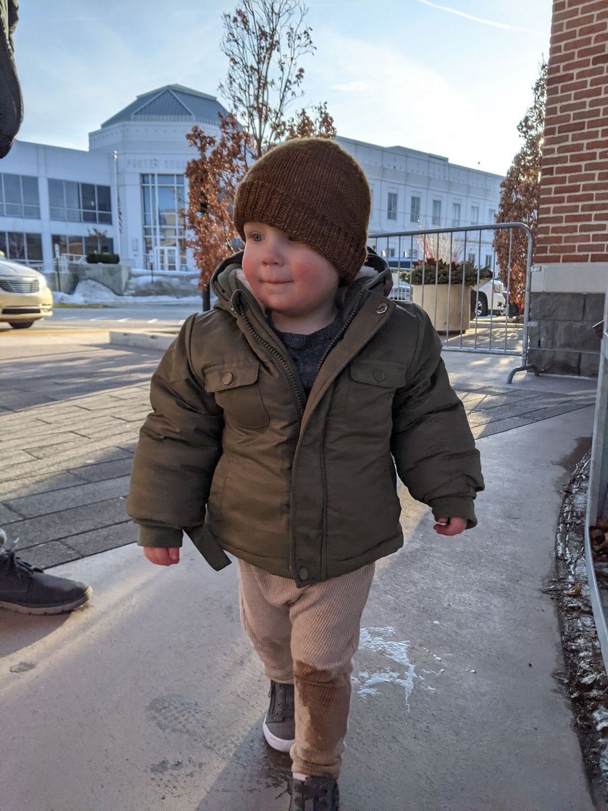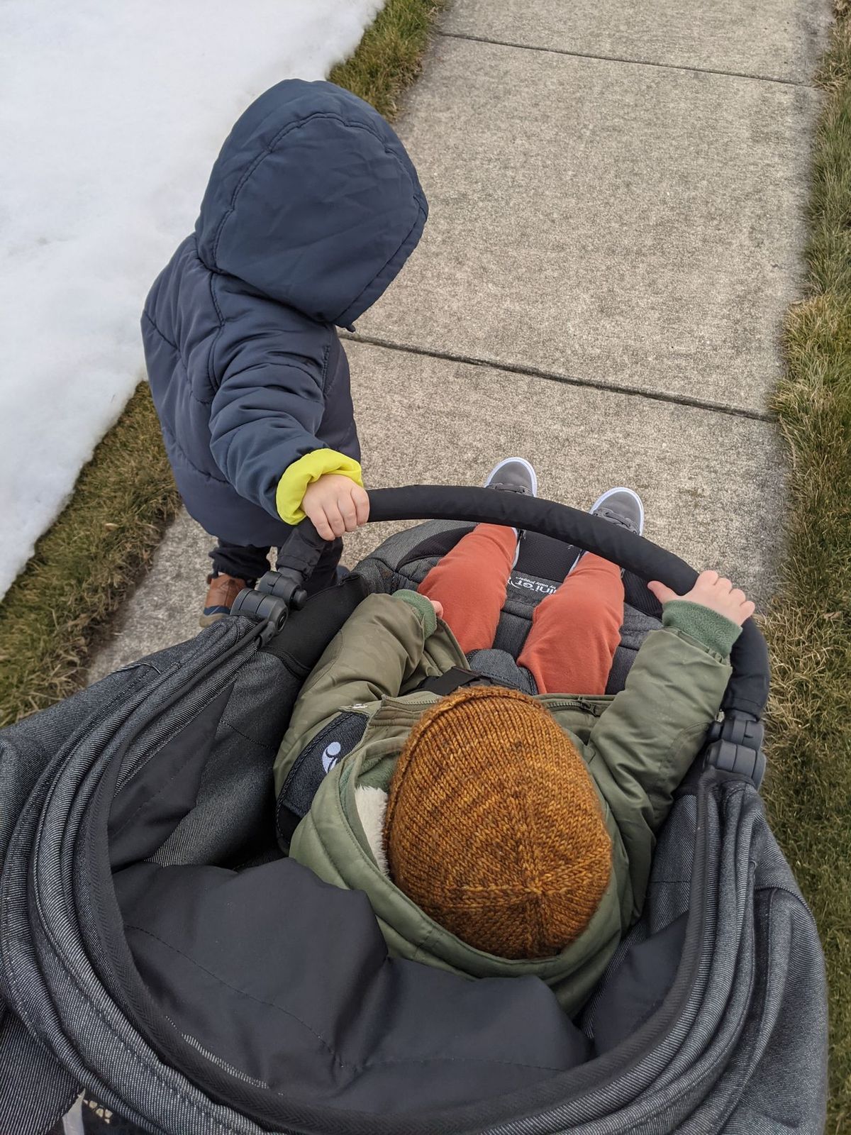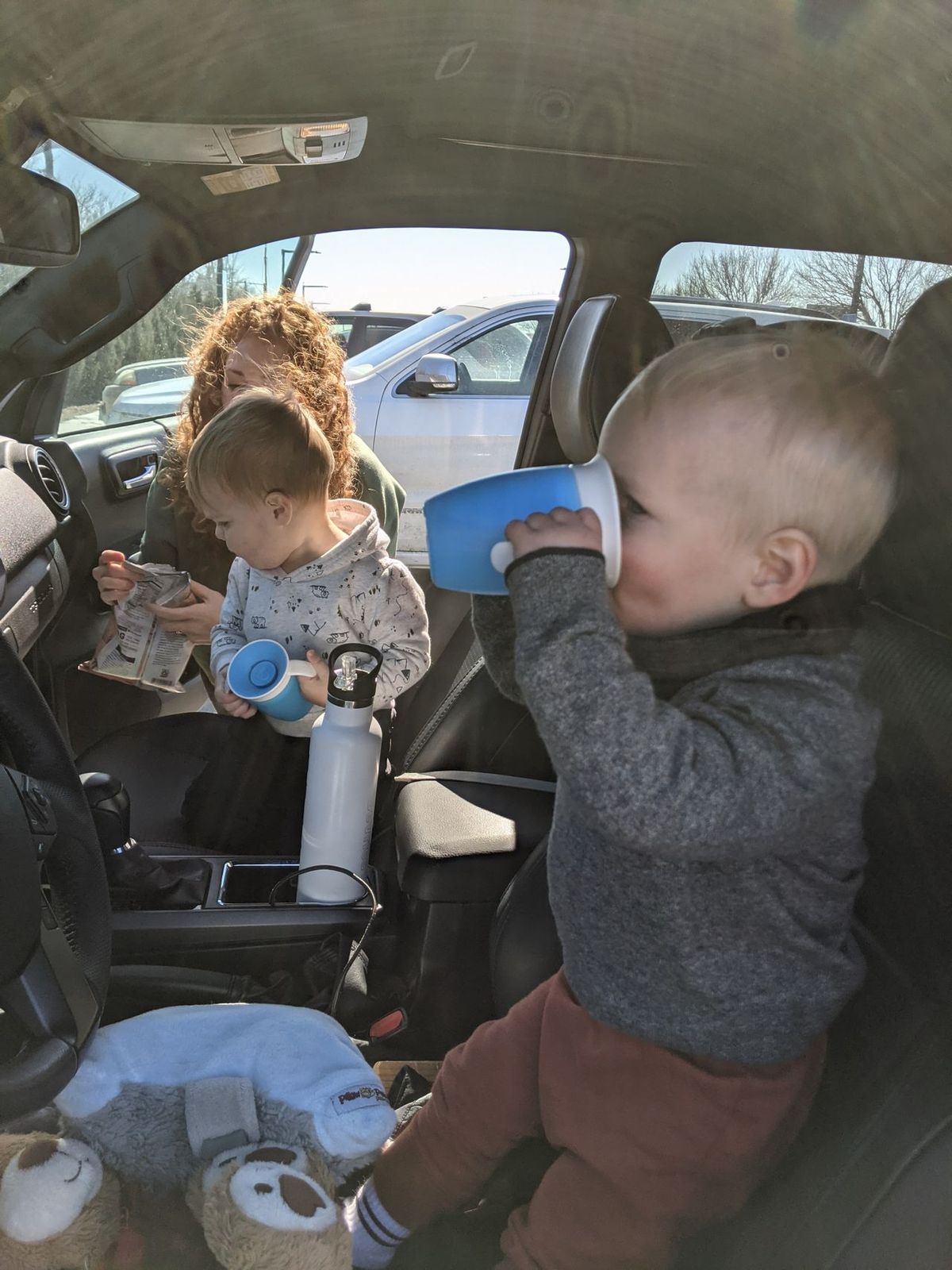 Sunday, after breakfast, we played church online on the TV, and the little boys danced to worship music. I think we had leftovers for lunch, and since the boys are on slightly different schedules (Coop does everything somewhat later in the day, including his nap), Cooper helped us make cookie dough for these yummy grain-free chocolate chip cookies. While the boys napped, Jessica knitted on a gauge swatch for a new project, and I knit some on my sweater. We went for a grey, chilly, blustery walk on a local trail, and then hurried home to warm up and make a dinner of quiche and roasted sweet potatoes. That night we talked about tea and life, and knit some more, packed snacks for their flight the following day, etc. And then on Monday, we dropped them off in at the airport, and Cooper nearly cried when Weston got out of the truck, already missing his little buddy.