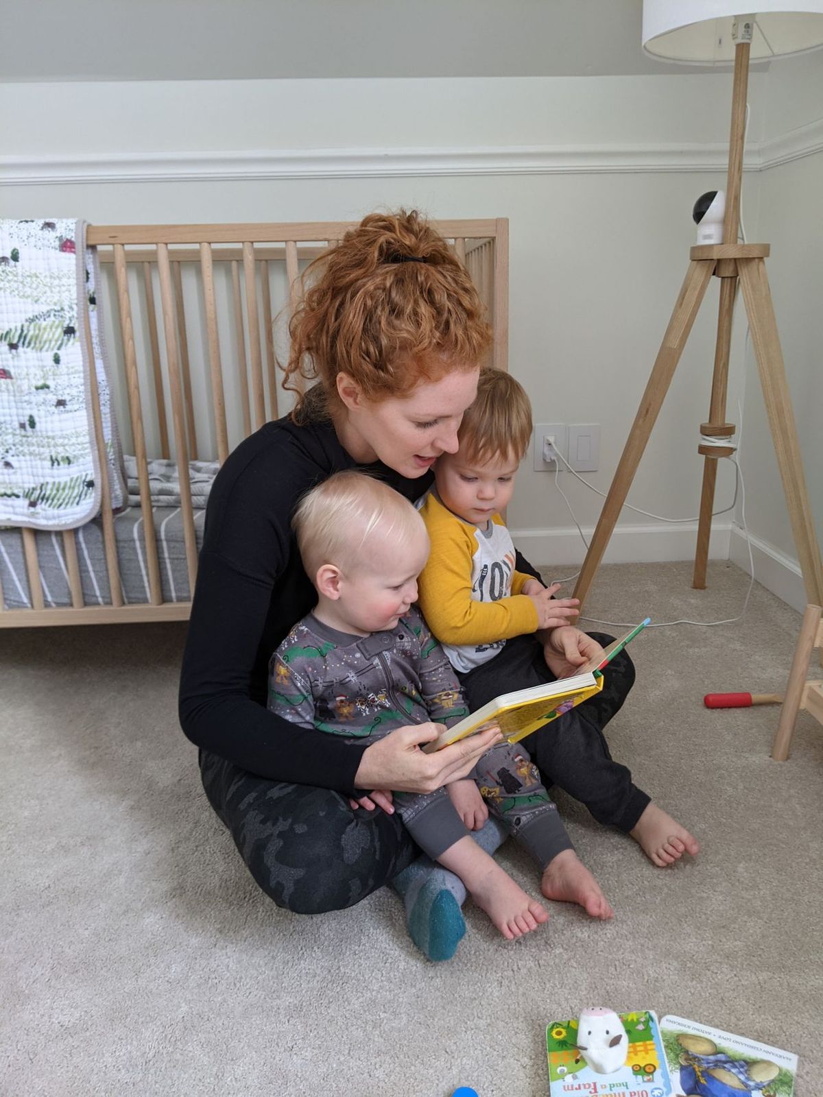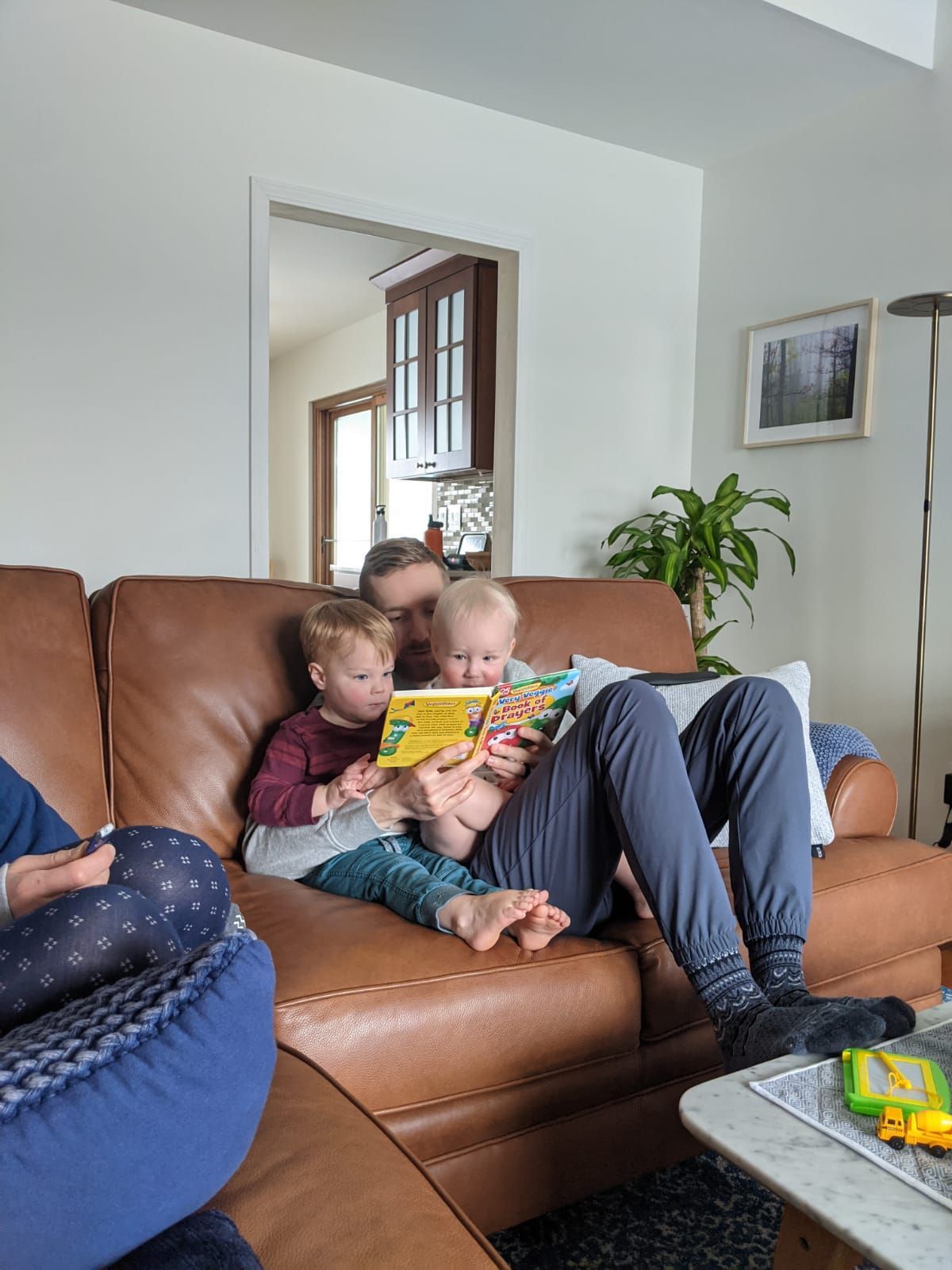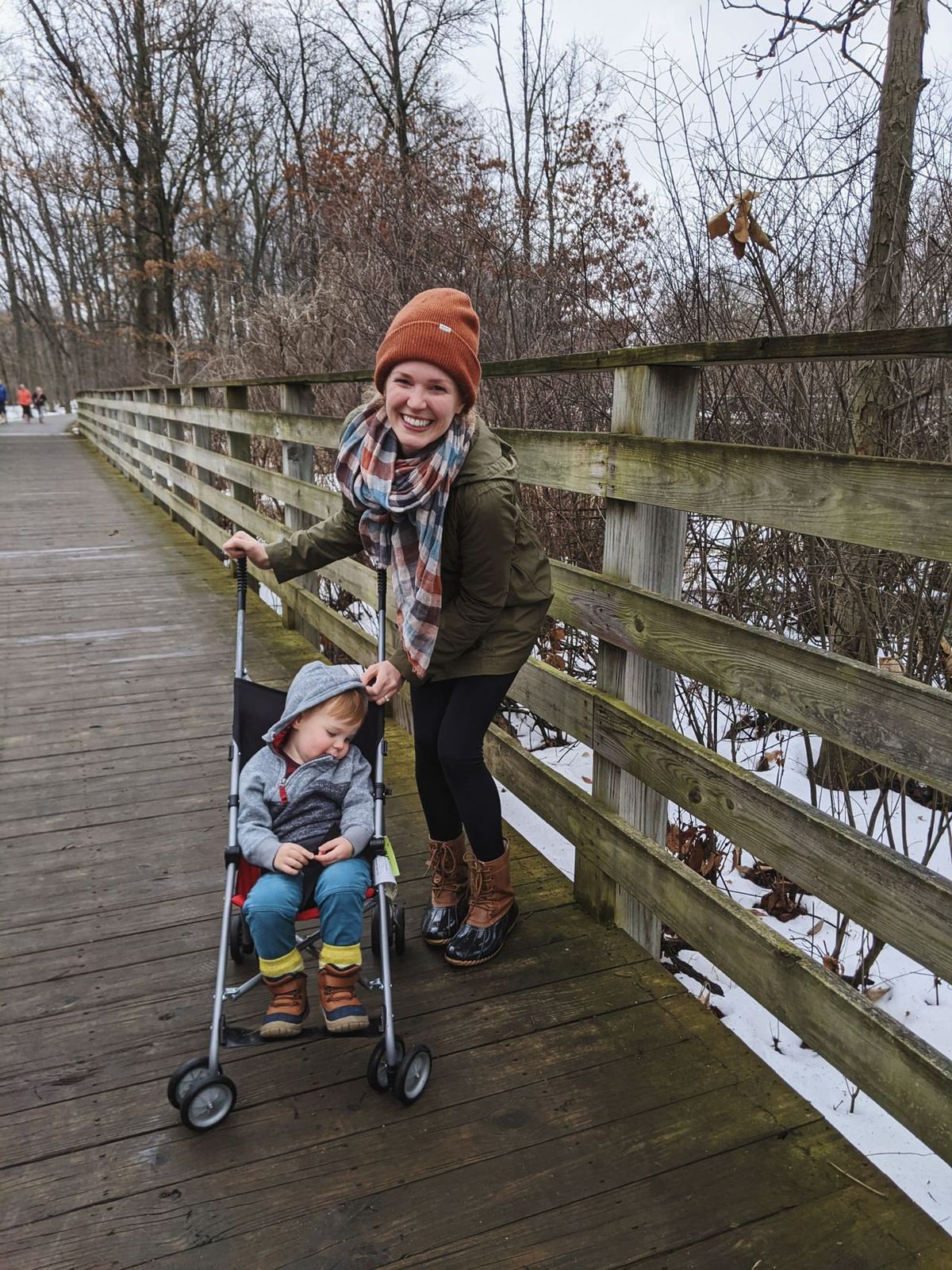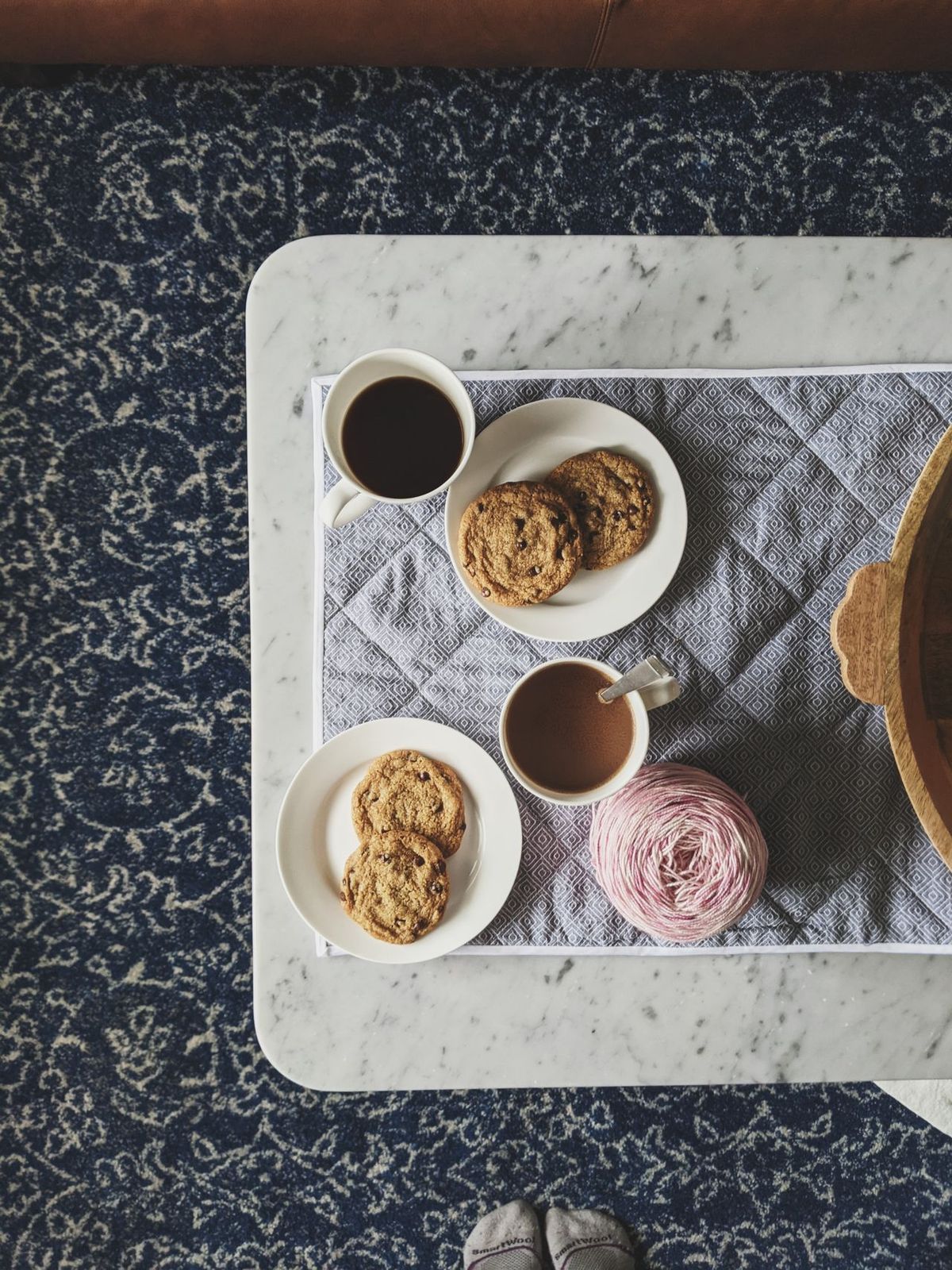 Sunday, after breakfast, we played church online on the TV, and the little boys danced to worship music. I think we had leftovers for lunch, and since the boys are on slightly different schedules (Coop does everything somewhat later in the day, including his nap), Cooper helped us make cookie dough for these yummy grain-free chocolate chip cookies. While the boys napped, Jessica knitted on a gauge swatch for a new project, and I knit some on my sweater. We went for a grey, chilly, blustery walk on a local trail, and then hurried home to warm up and make a dinner of quiche and roasted sweet potatoes. That night we talked about tea and life, and knit some more, packed snacks for their flight the following day, etc. And then on Monday, we dropped them off in at the airport, and Cooper nearly cried when Weston got out of the truck, already missing his little buddy.