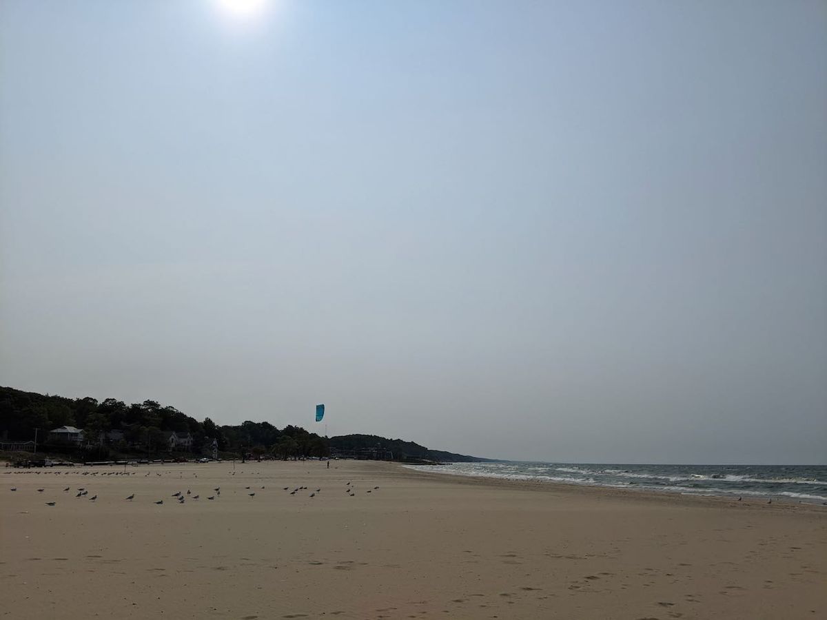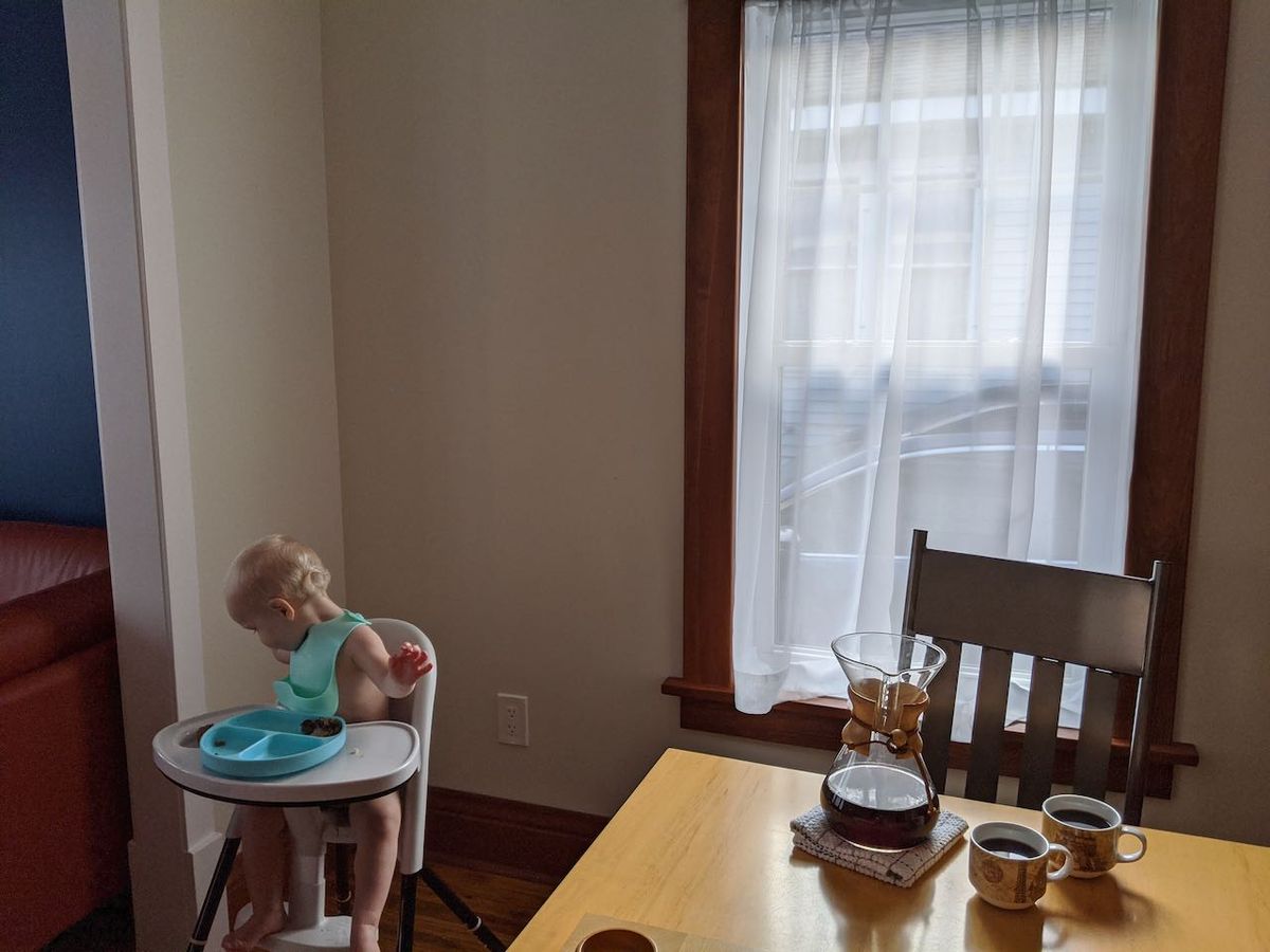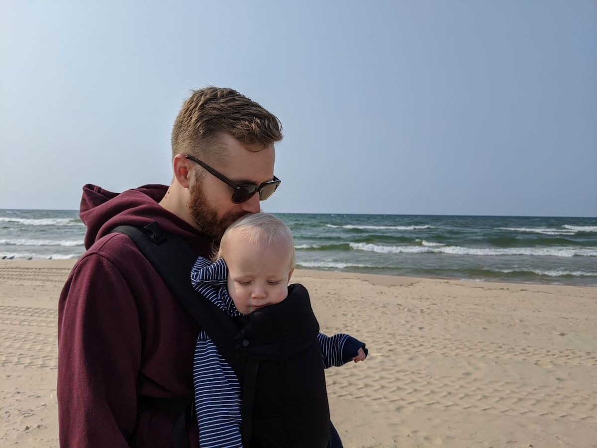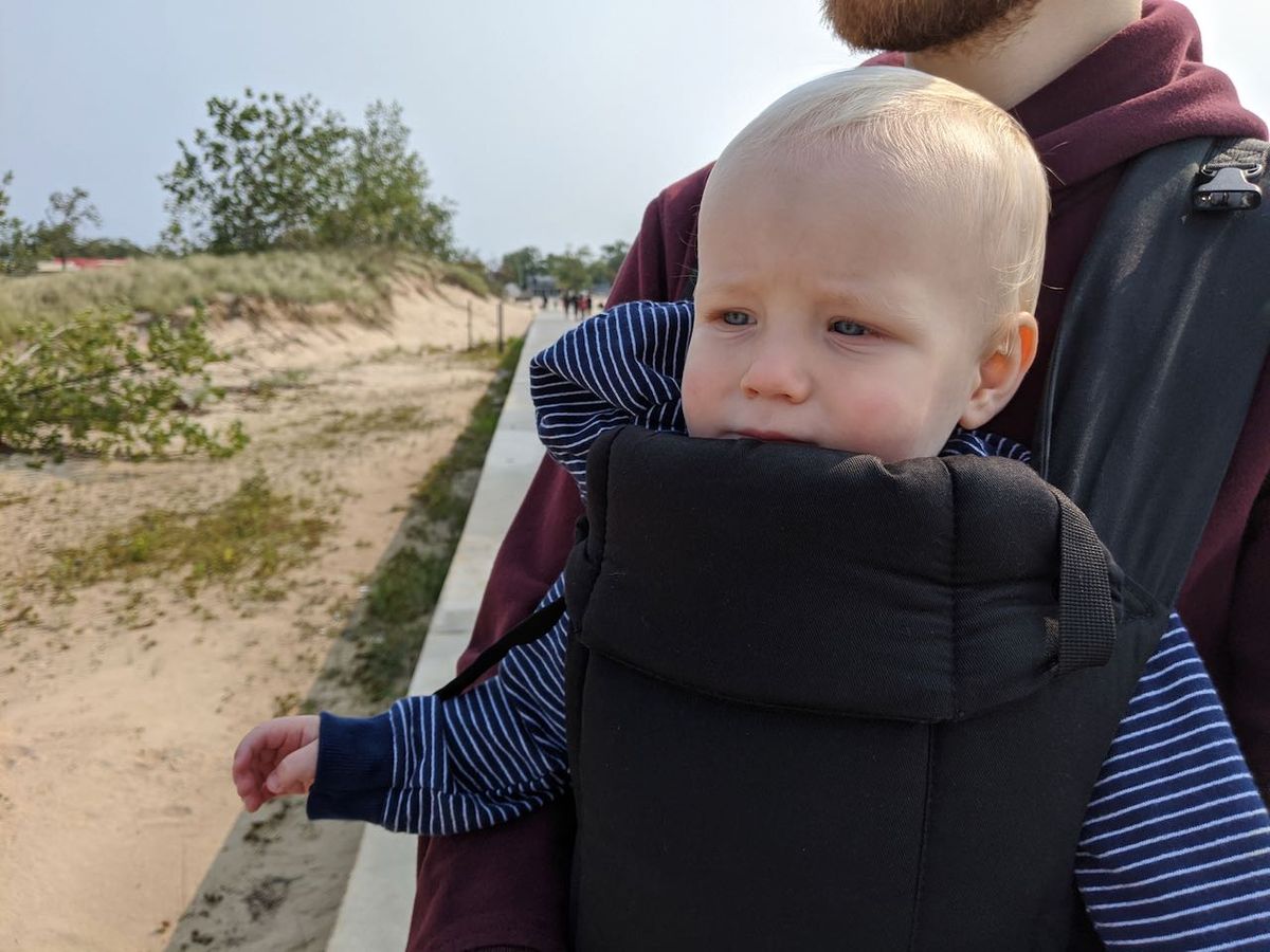 The next morning, I brewed coffee in the AirBnb's Chemex, which I haven't done since having coffee at my friend Molly's house in Austin(!) and got our breakfast ready, comprised of hard boiled eggs, grain-free muffins, and sausages we brought from home. After cleaning up the baby, floors, high chair, etc., we took turns getting dressed and ready for day and minding the ever-curious Cooper. Then we drove just over five minutes to a lakeside park for a little playground time and then a long walk along the boardwalk and sand. Lake Michigan was wild, with big waves and lots of kitesurfers. Cooper was thrilled to be in the carrier, facing out, taking it all in.
