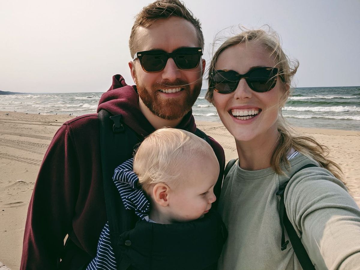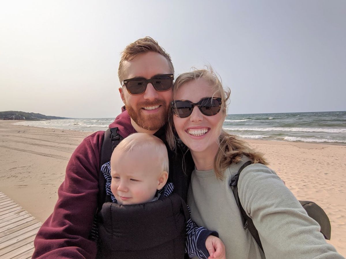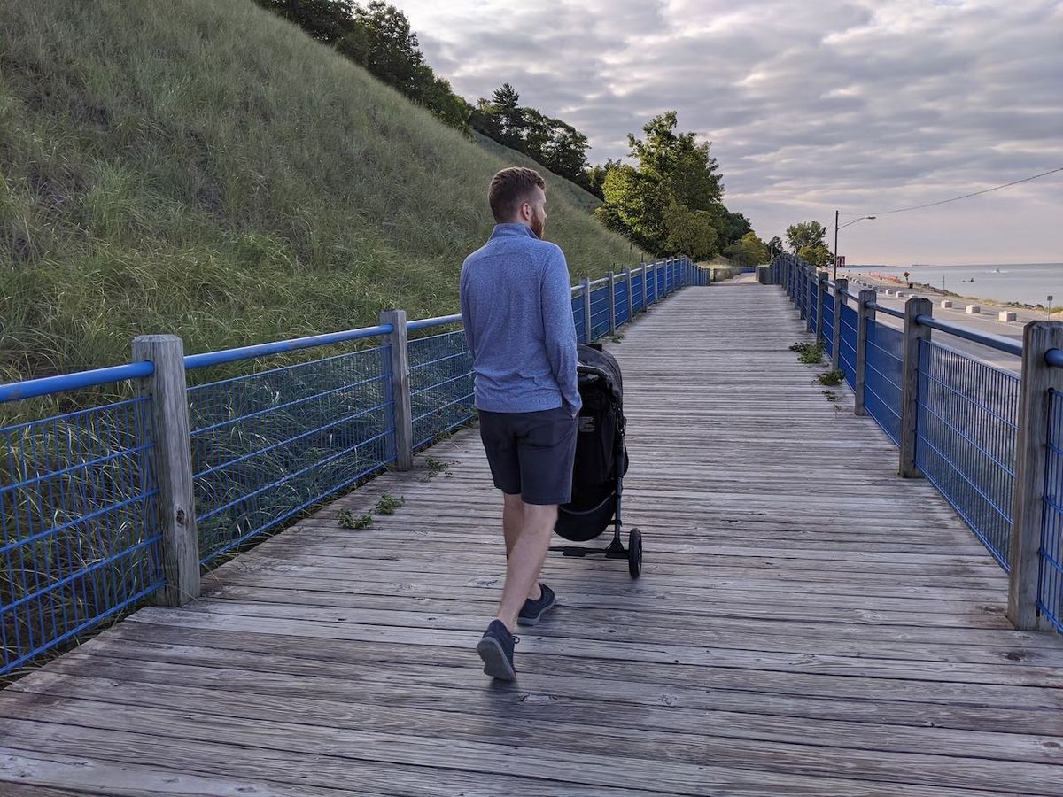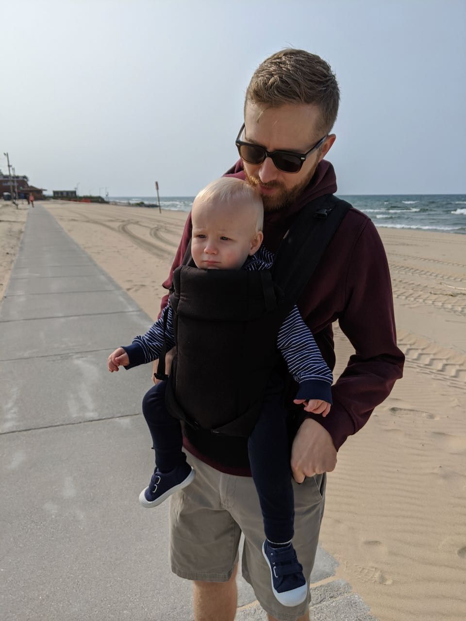The next morning, I brewed coffee in the AirBnb's Chemex, which I haven't done since having coffee at my friend Molly's house in Austin(!) and got our breakfast ready, comprised of hard boiled eggs, grain-free muffins, and sausages we brought from home. After cleaning up the baby, floors, high chair, etc., we took turns getting dressed and ready for day and minding the ever-curious Cooper. Then we drove just over five minutes to a lakeside park for a little playground time and then a long walk along the boardwalk and sand. Lake Michigan was wild, with big waves and lots of kitesurfers. Cooper was thrilled to be in the carrier, facing out, taking it all in.