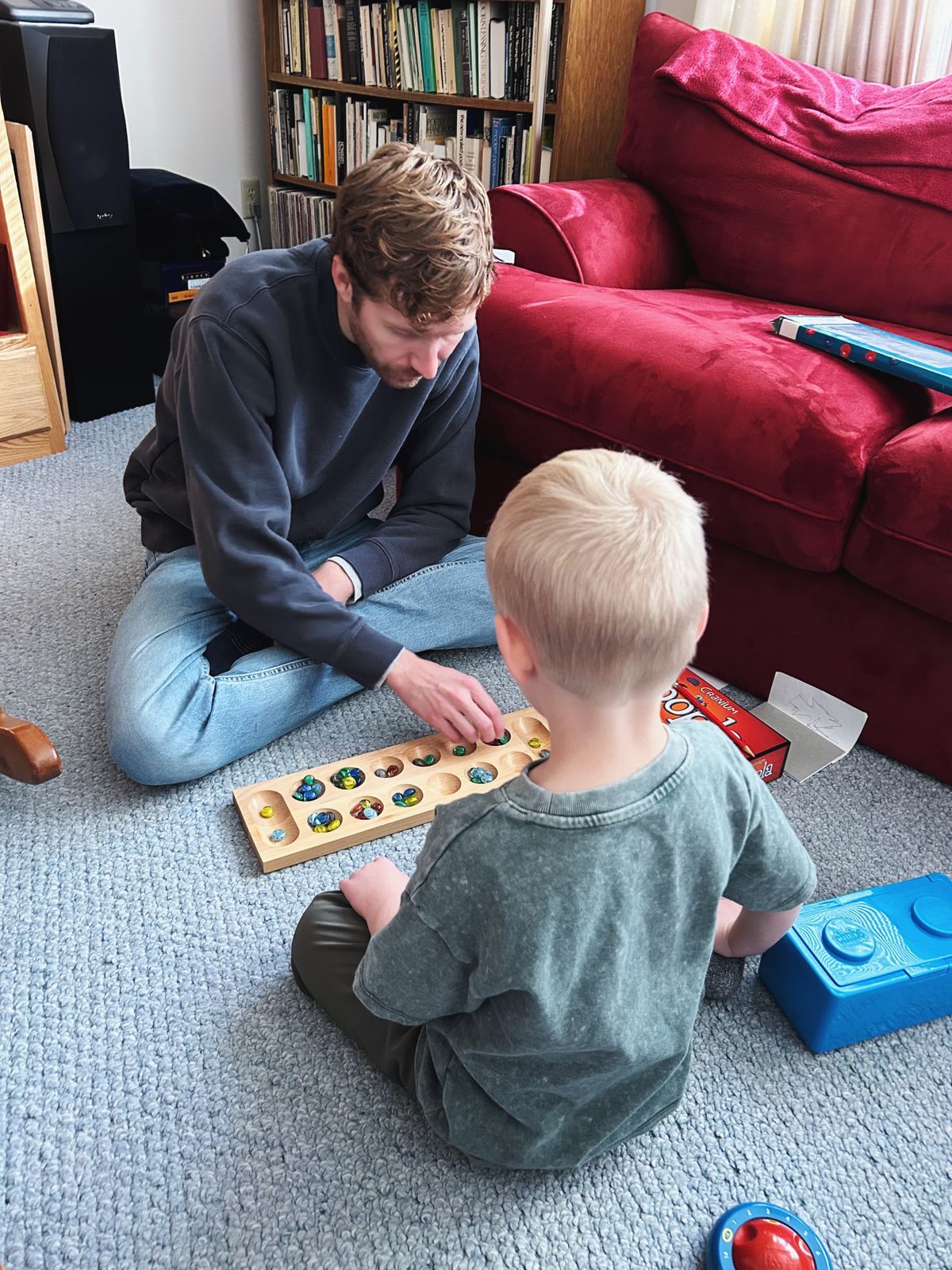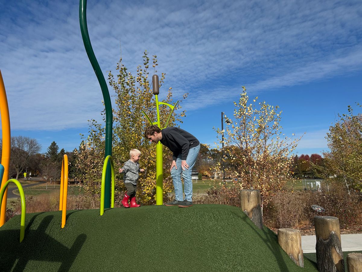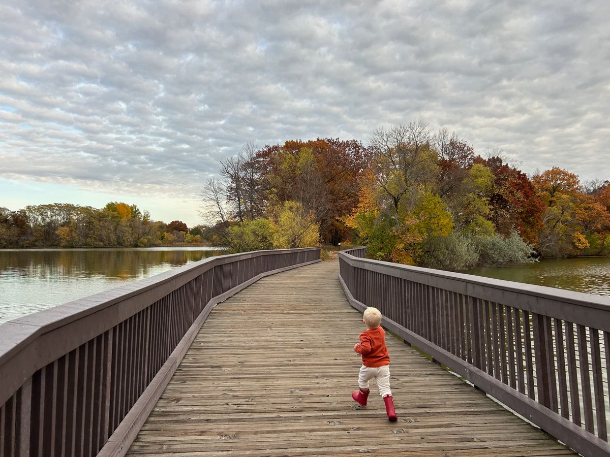 When we arrived, we ate dinner, which was beef stew in the crockpot that my mom had made, and I brought homemade sourdough bread to accompany. The next day (Saturday), we had a slow morning at my parents', with coffee and breakfast. Nicholas taught Cooper how to play mancala and chess for the first time, and the boys played with marbles and agates and any little items (anything novel and small enough to hold is deemed fascinating). After an early-ish lunch, we headed out for some fresh air. It was a beautiful October day! Sunny and breezy and crisp. My brother Matt had the idea to take the boys to a really neat park nearby and they loved it. Cooper ran around nonstop and Finn enjoyed himself too, after a car nap. We did a walk around a nearby pond, as well.