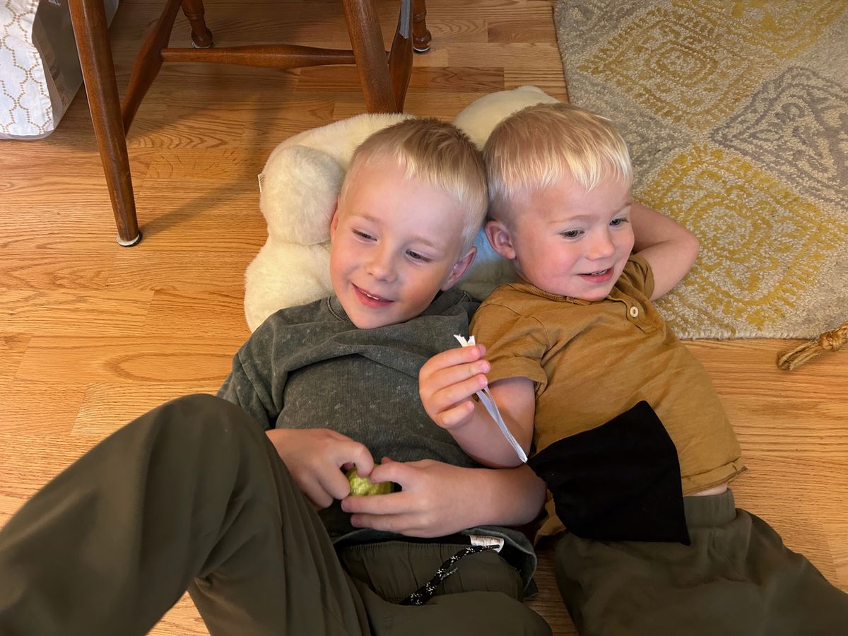 - The boys playing with a very large stuffed bear (aptly named "Bear") that my brother and I used to prank each other with