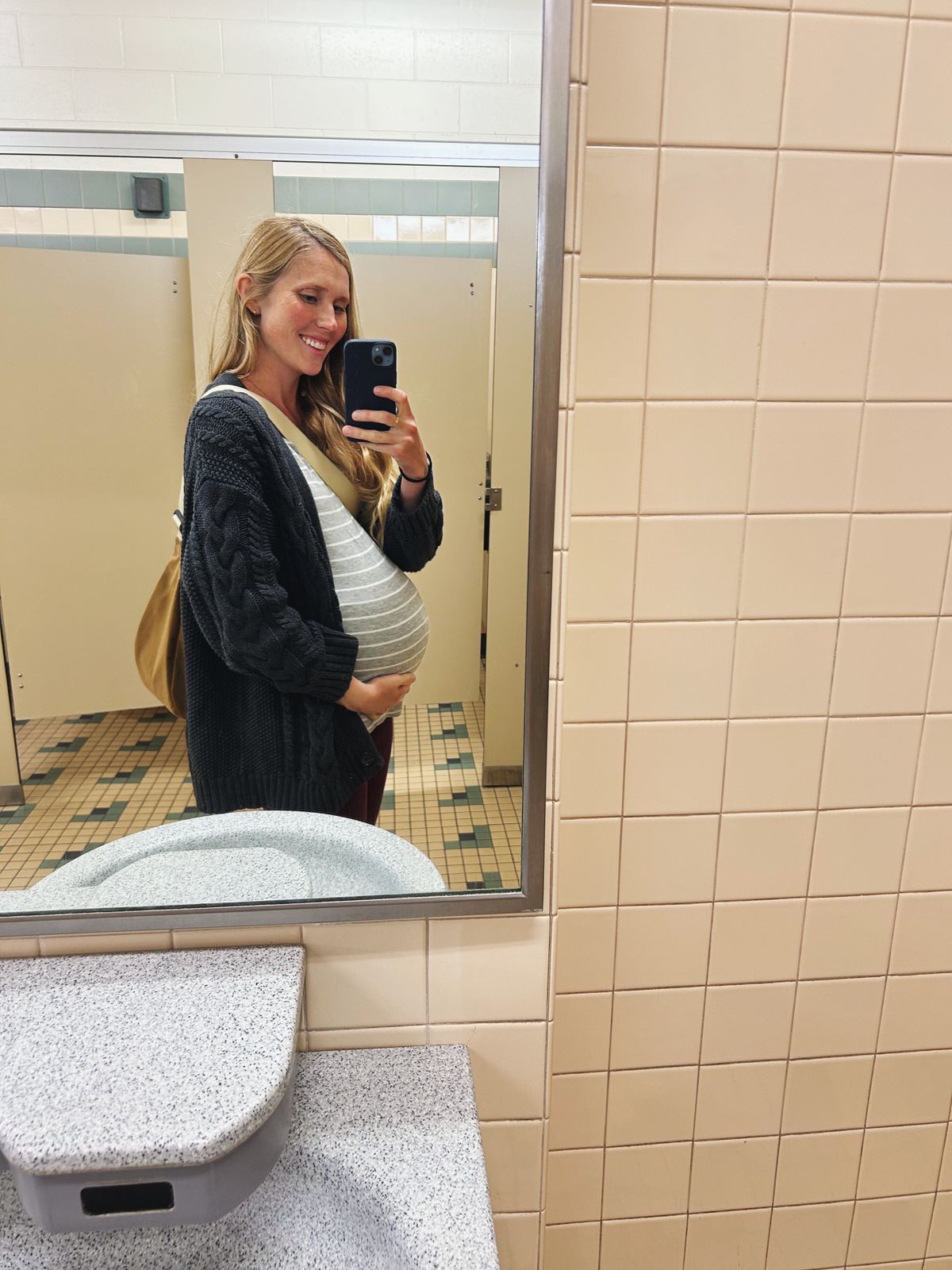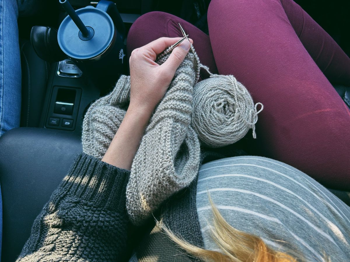 A rest area bathroom selfie (L), and a Traveler sweater, in progress (R)