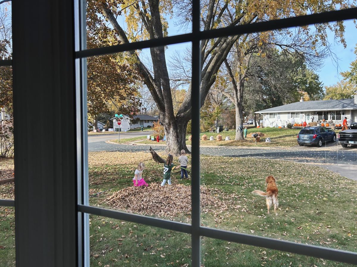 - the joy on the kids' faces as they jumped in leaves and ran around the front yard with our friends' golden retriever