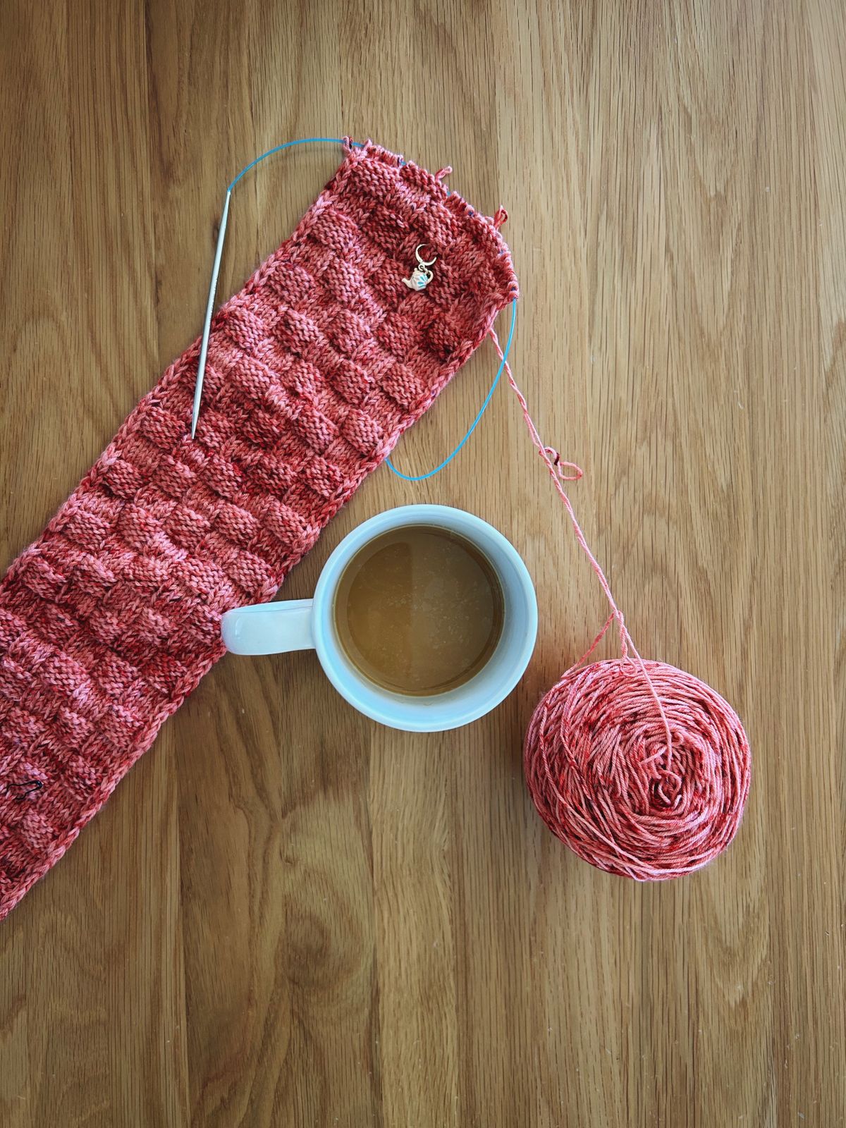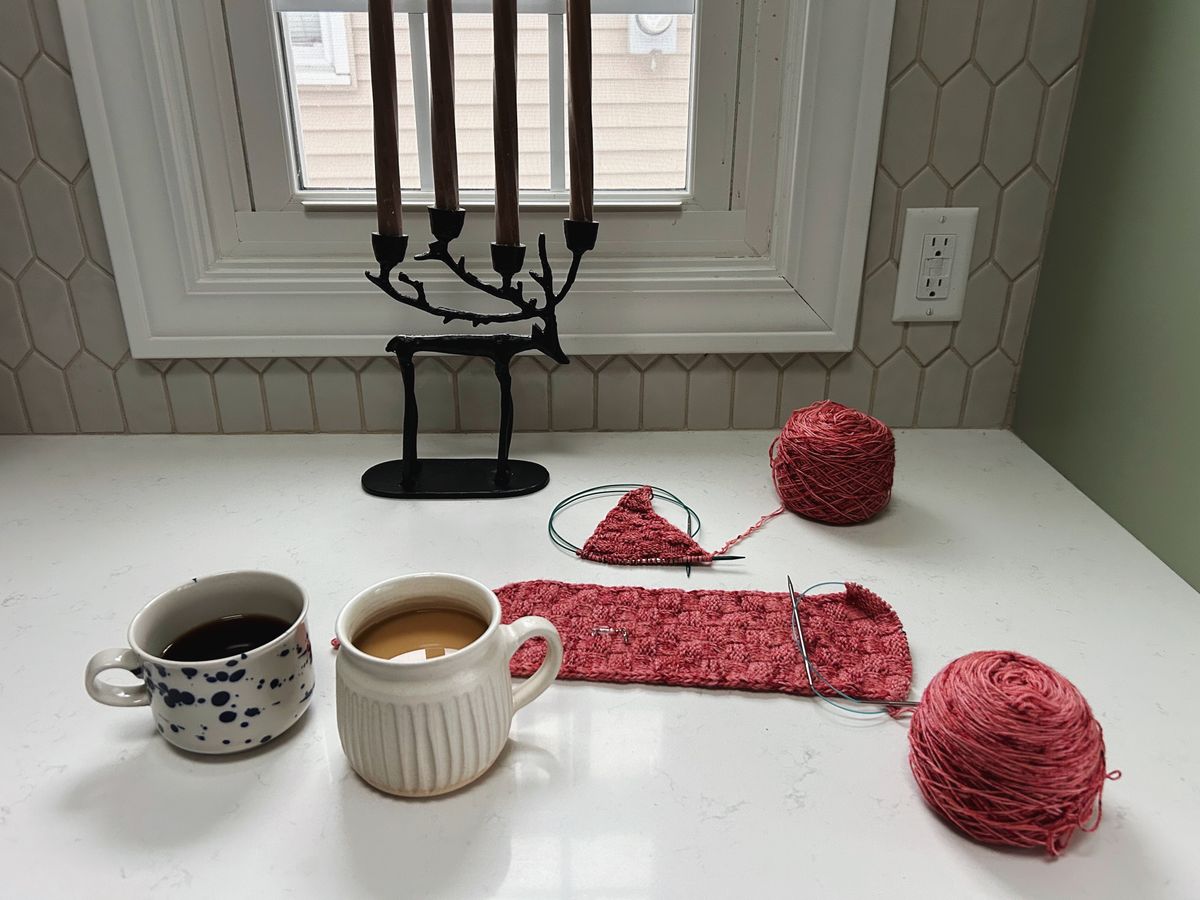 I am still chipping away at a small scarf that I'm knitting with my friend Molly for a mini friend Knit A Long (KAL). We're knitting the Szachmat scarf and working with a yarn she bought in Maine for us (so special)! I have the basketweave texture mostly memorized at this point, so it's enjoyable to pick up and work a few rows on it, here and there, but I'm in no rush to finish it, since we're knitting along together. More details can be found on my Ravelry project page.
