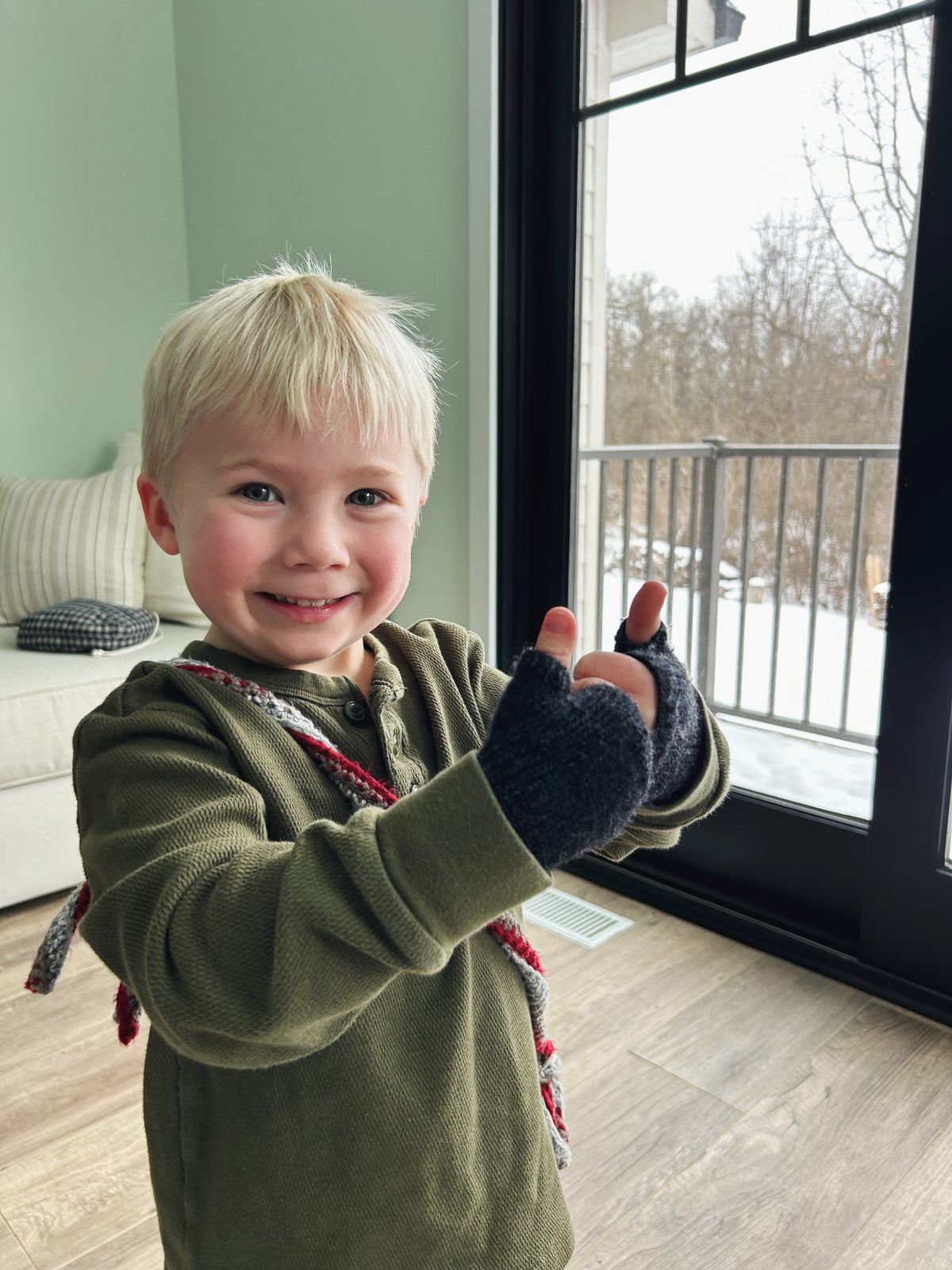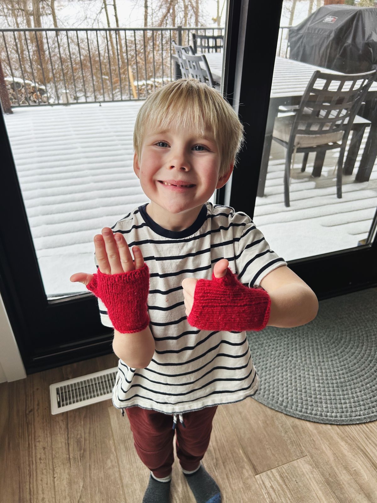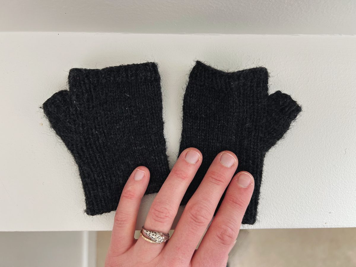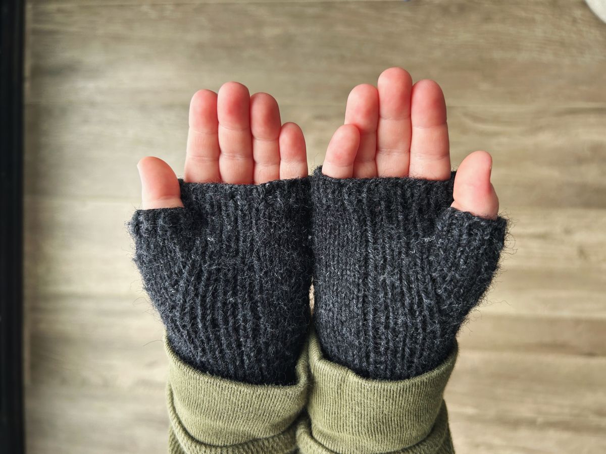 And finally, I completed a pair of fingerless gloves for each of the big boys. Finn wore a pair of inexpensive black acrylic mittens around the house every day for months, but he would have to take them off every few minutes to use his hands. Nicholas suggested that I could make him a pair of fingerless mitts, an idea to which I responded, "Yes!" of course. I could not find a kid's pattern for fingerless mitts that had the characteristics I was looking for, so I opted to modify a pattern I've knit at least 12 times now, the Align mitts. It is sadly no longer available as a digital pattern, but I still have a PDF of the (free) pattern from years ago. I grabbed some leftover Paton's Kroy socks in a very dark, "gentry gray," and some US 1 needles, and modified my gauge and stitch counts a bit to fit an almost 4-year-old's hands.