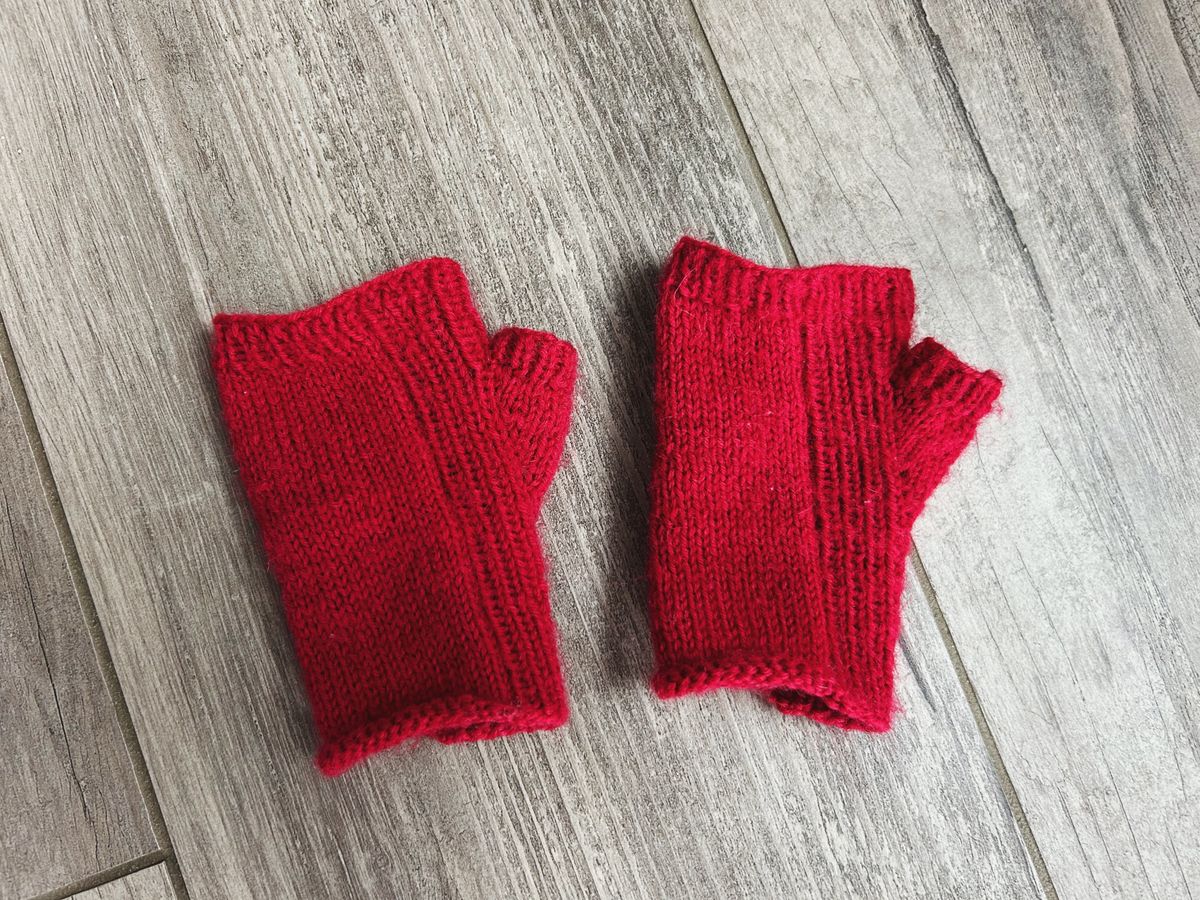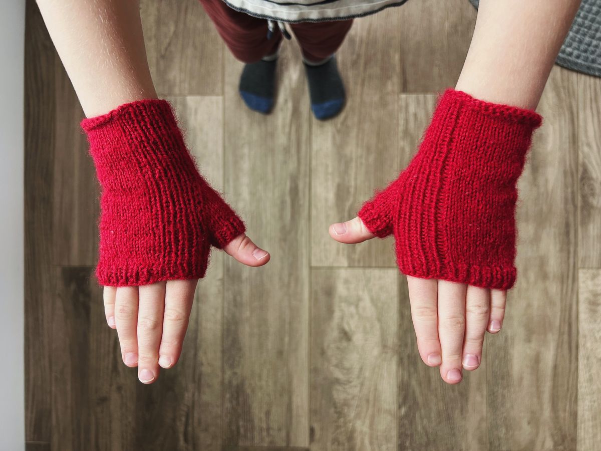And once Finn's pair was done, I cast on a pair for Cooper, this time in a red, per his request, but also in Paton's Kroy socks. I used the same needles and stitch count, but altered the lengths a bit to fit his larger hands. He was also thrilled with his pair of fingerless mitts, though they haven't seen the laughable amount of wear that Finn's have, as of yet. For details on Cooper's pair, see my ravelry project page.