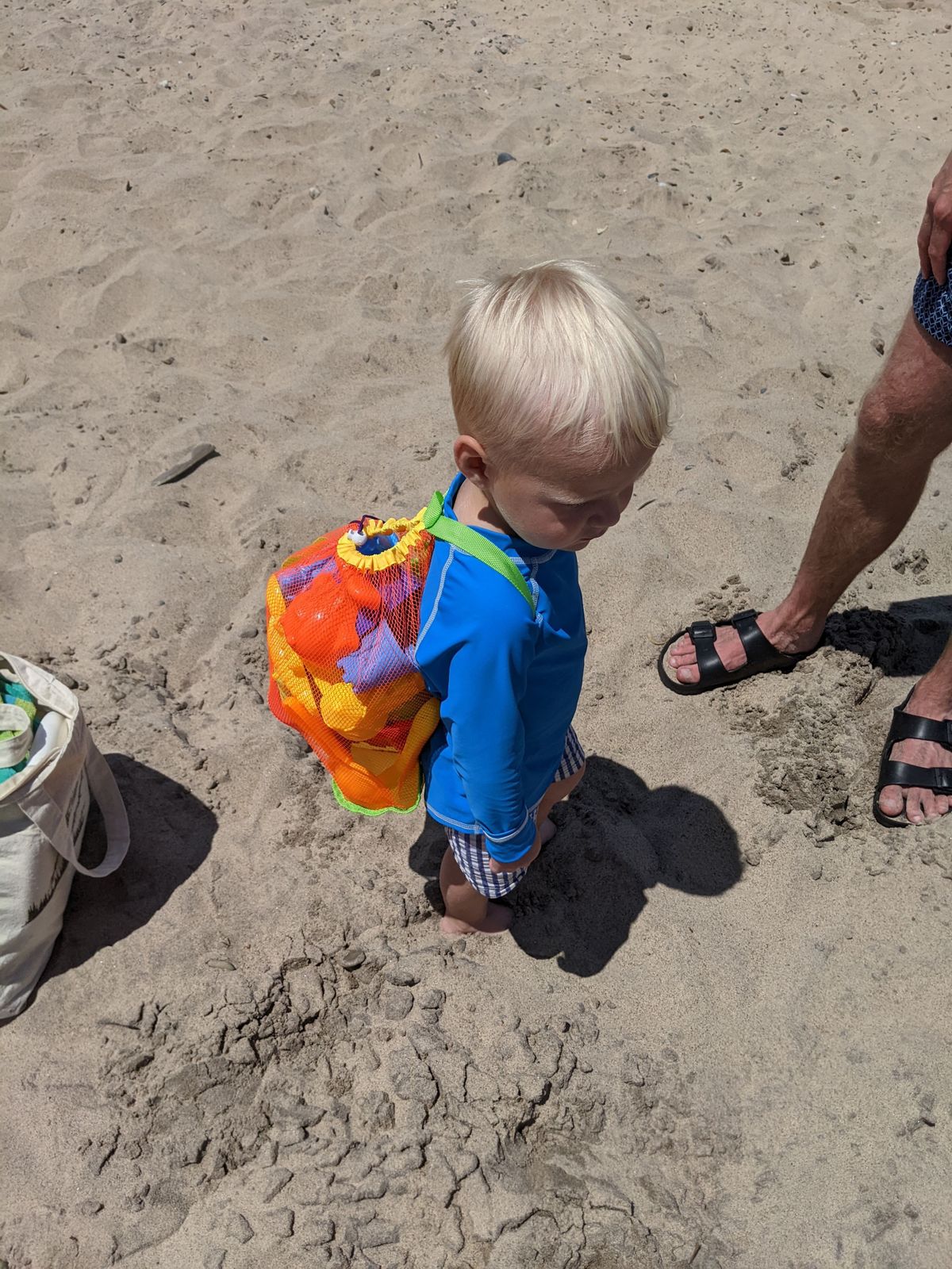 A few weeks ago, our little family of four made plans with my father- and sister-in-law for an early Saturday morning at the Lake. When we arrived in the eight o'clock hour, it was breezy, in the low seventies. At this particular beach and time of day, we had our pick of spots; only a few families were there before us. I chose a spot pretty close to the water and Coop dumped out his new beach toys out of his mesh bag and got busy building and digging. Soon enough, Nicholas, who had been parking the truck, and my SIL and FIL joined us.
