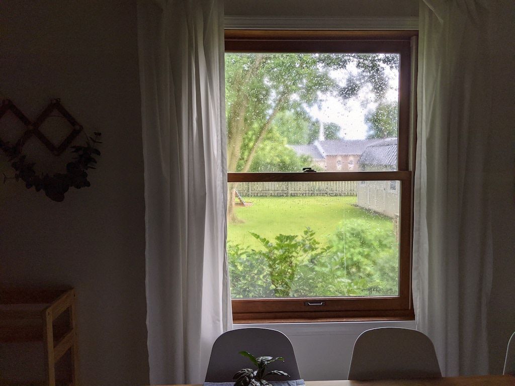 Finding beauty in the way the water beads up on our kitchen window, alongside sunlight peeking in, after a rain.