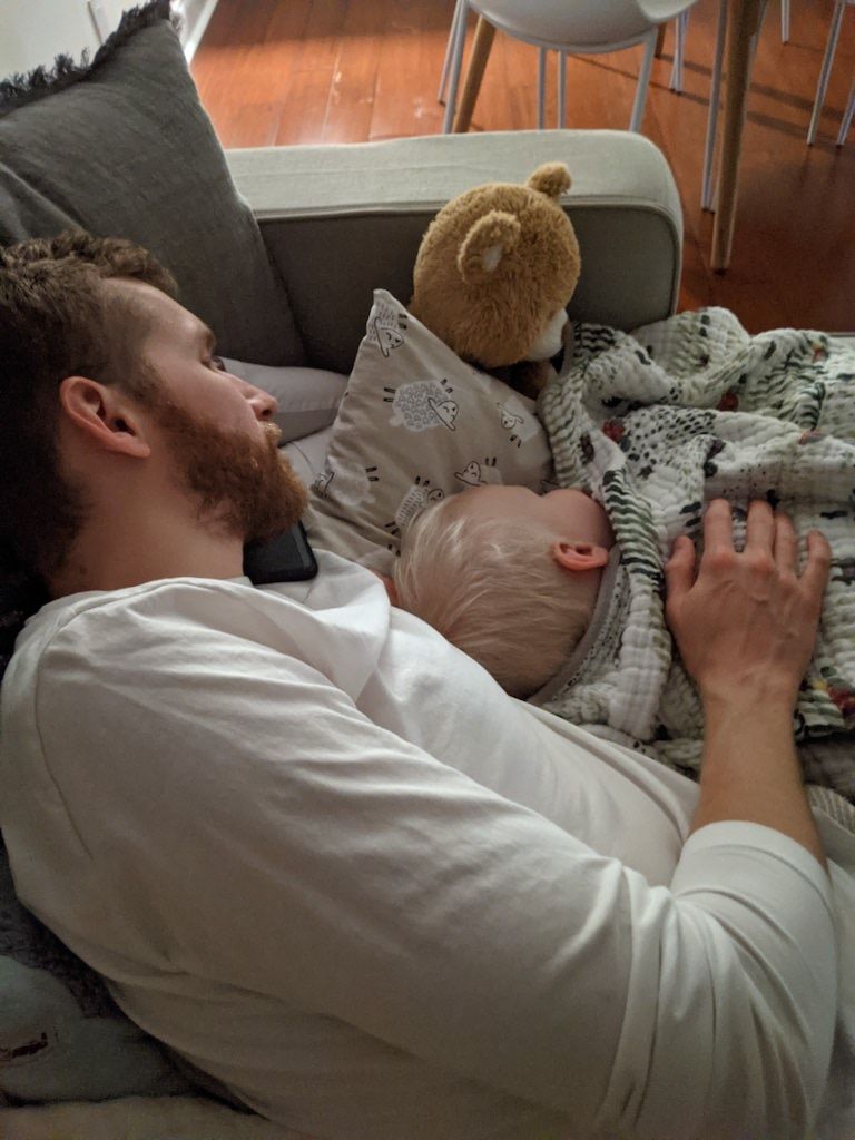 Snuggling up in the basement on a night with a tornado warning (we were fine, and so was our home). Bear came with us for that too.