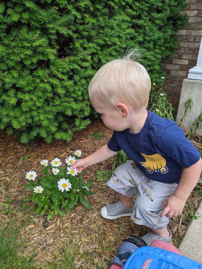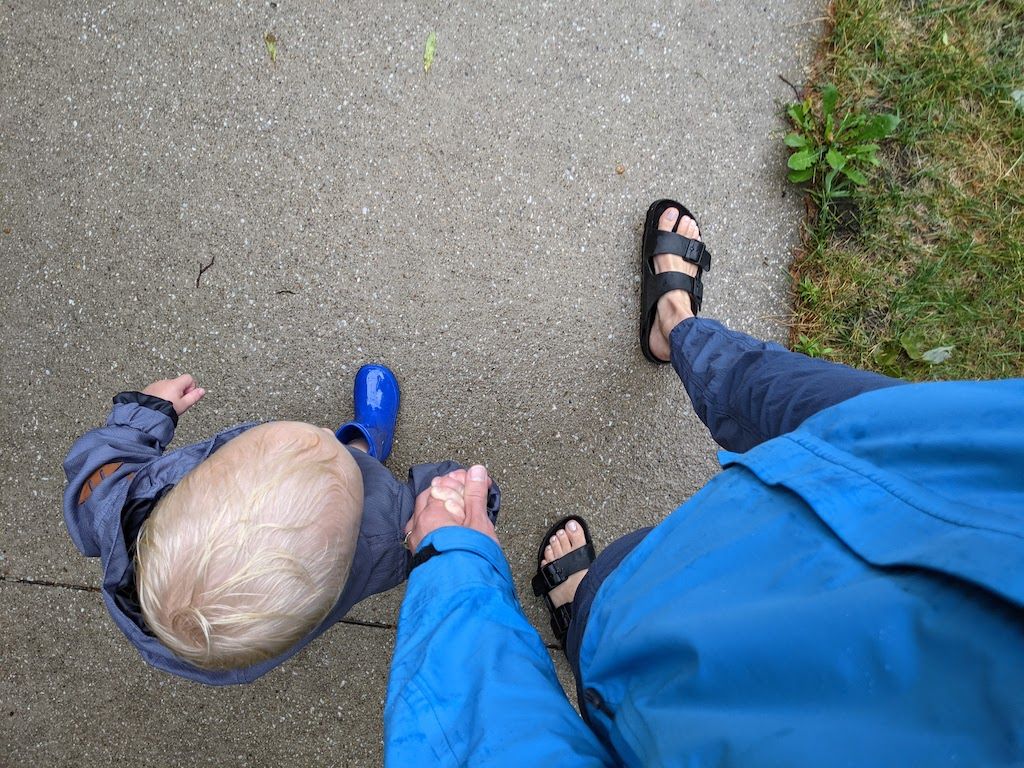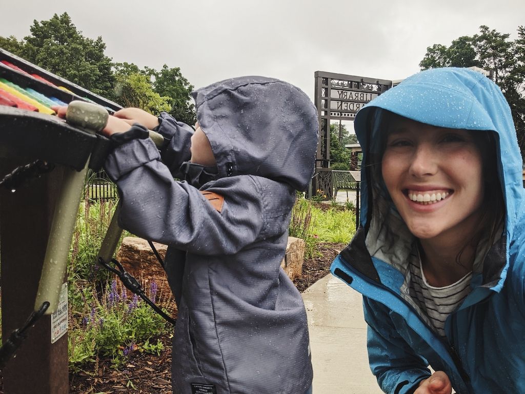 Meandering through a new interactive garden across from the library, in the rain. We were the only two there, and oh, what fun Cooper had.