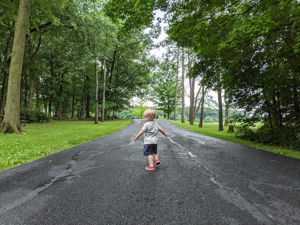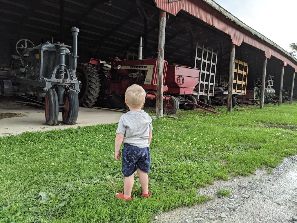 Visiting a local farm that is now also a park. It was a drizzly, wet day, with ominous clouds, but we explored for awhile. He was particularly enamored with the tractors (kept saying "big tractors"), as well as some farm animals they keep on the property. He splashed in every puddle he possibly could, of which there were many.