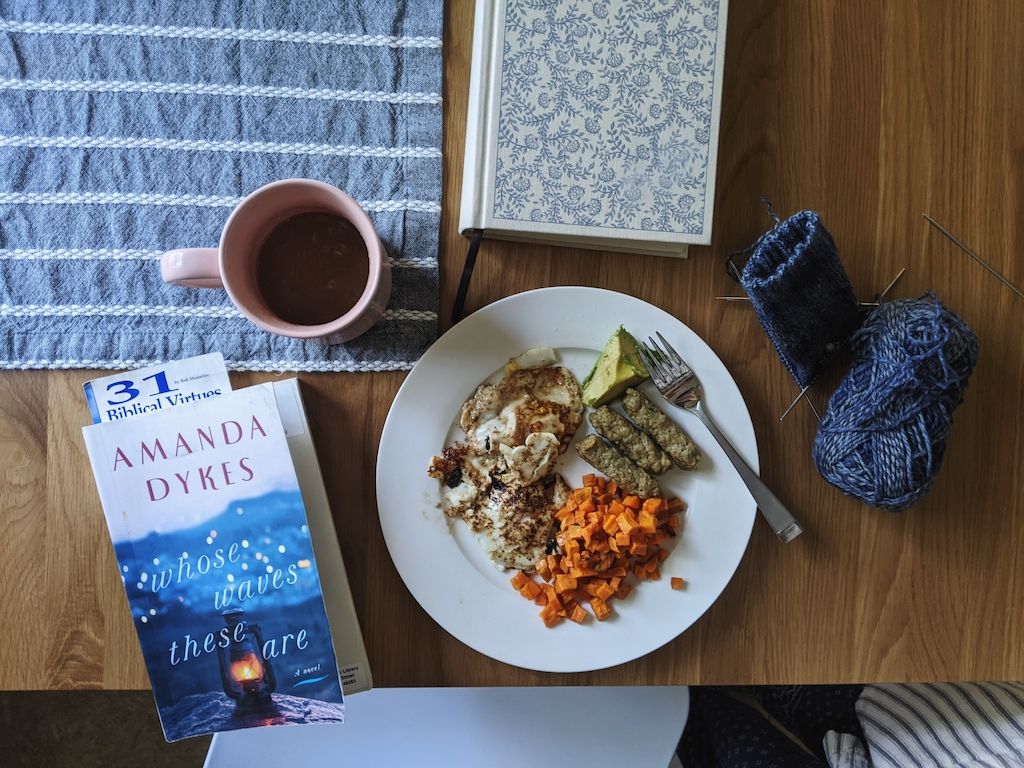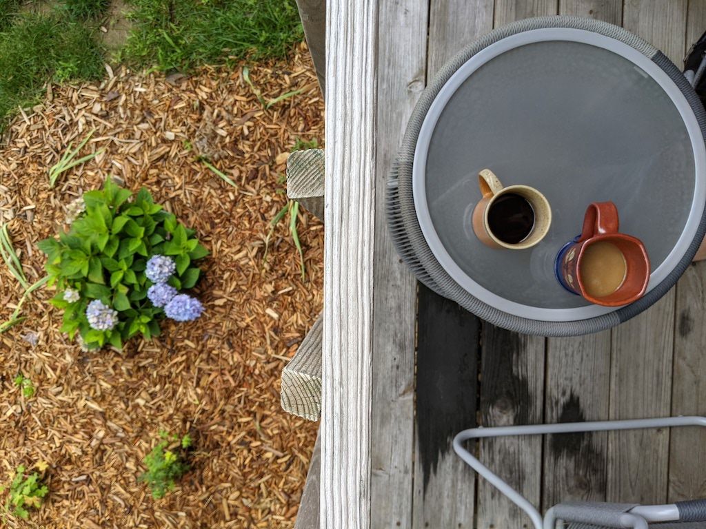 Coffee and/or breakfast on the three-season porch when temperature and time allows. It is the best place to sit on cool mornings, especially if I have some extra time before Cooper wakes.