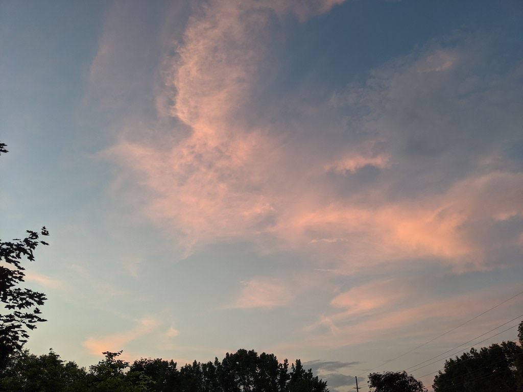 A smattering of pink evening clouds in the sky.