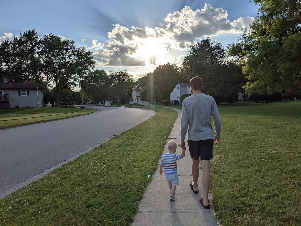 Family walks after dinner, holding hands with our little boy.