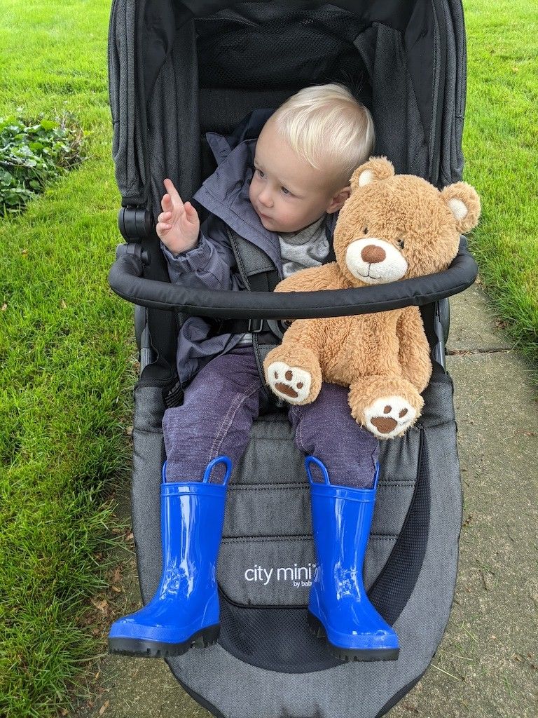 Dressing for a walk in the rain, and a bear companion.