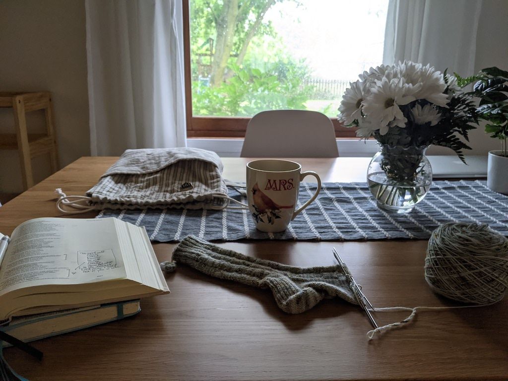 Drinking tea in the evenings, knitting socks (because Summer Sock Camp is in full swing), and thoroughly enjoying a library book my mom recommended.
