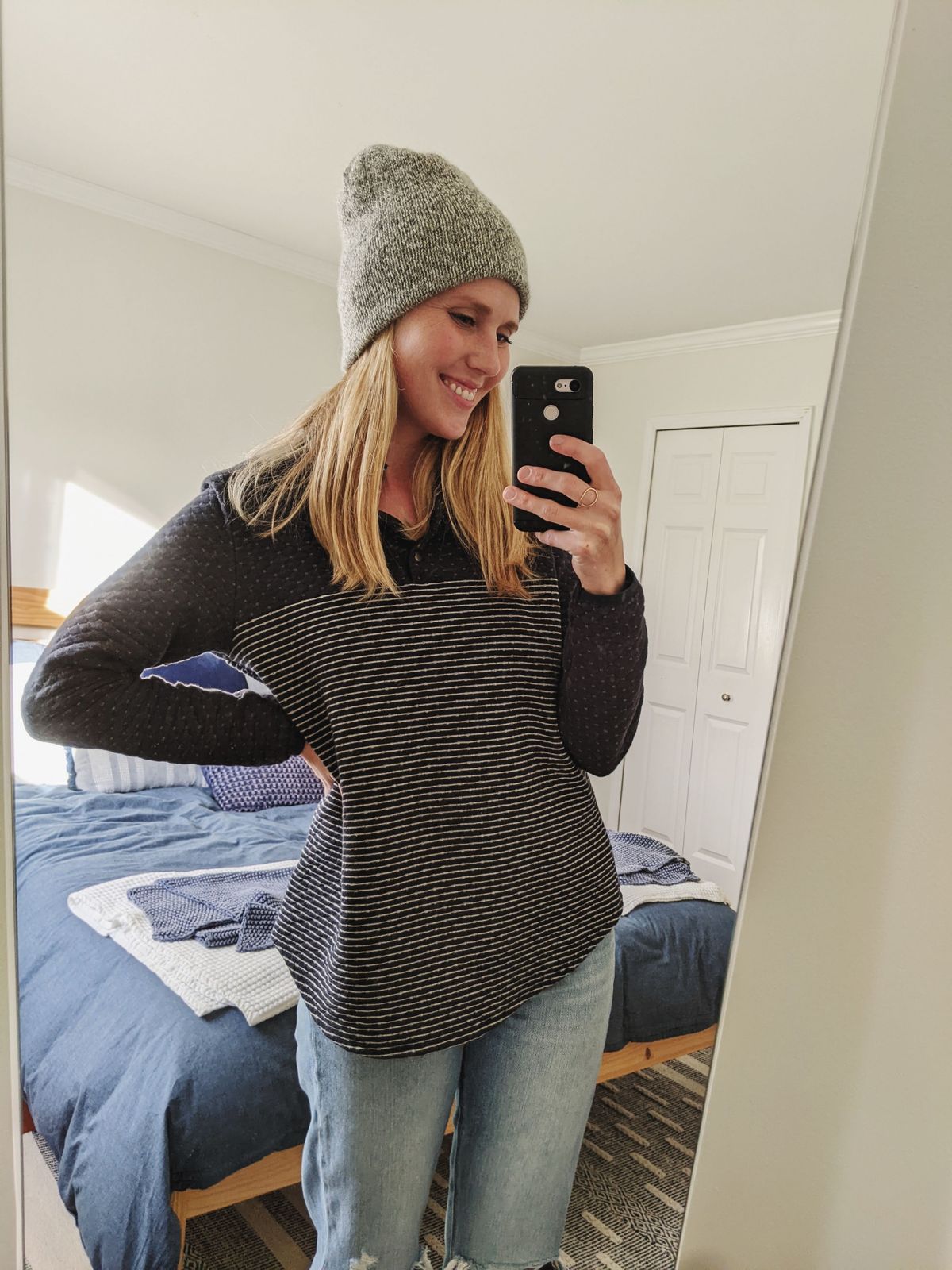 A second project utilized some yarn I picked up in the spring from my local yarn shop (LYS). I've been wanting to knit a marled grey hat for awhile, and since I already had the Musselburgh hat pattern in my library and it has a wide range of suitable gauges, the pattern and yarn were a good fit. The yarn is a 50/50 alpaca/wool blend, and it is a tiny bit itchy, but it is incredibly warm and I've already worn it several times. I highly recommend this pattern–it's miles of stockinette stitch, but I find that meditative these days. More details about this project are linked in my Ravelry project page.