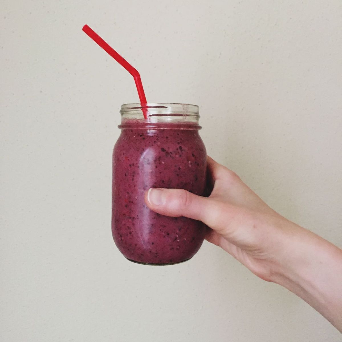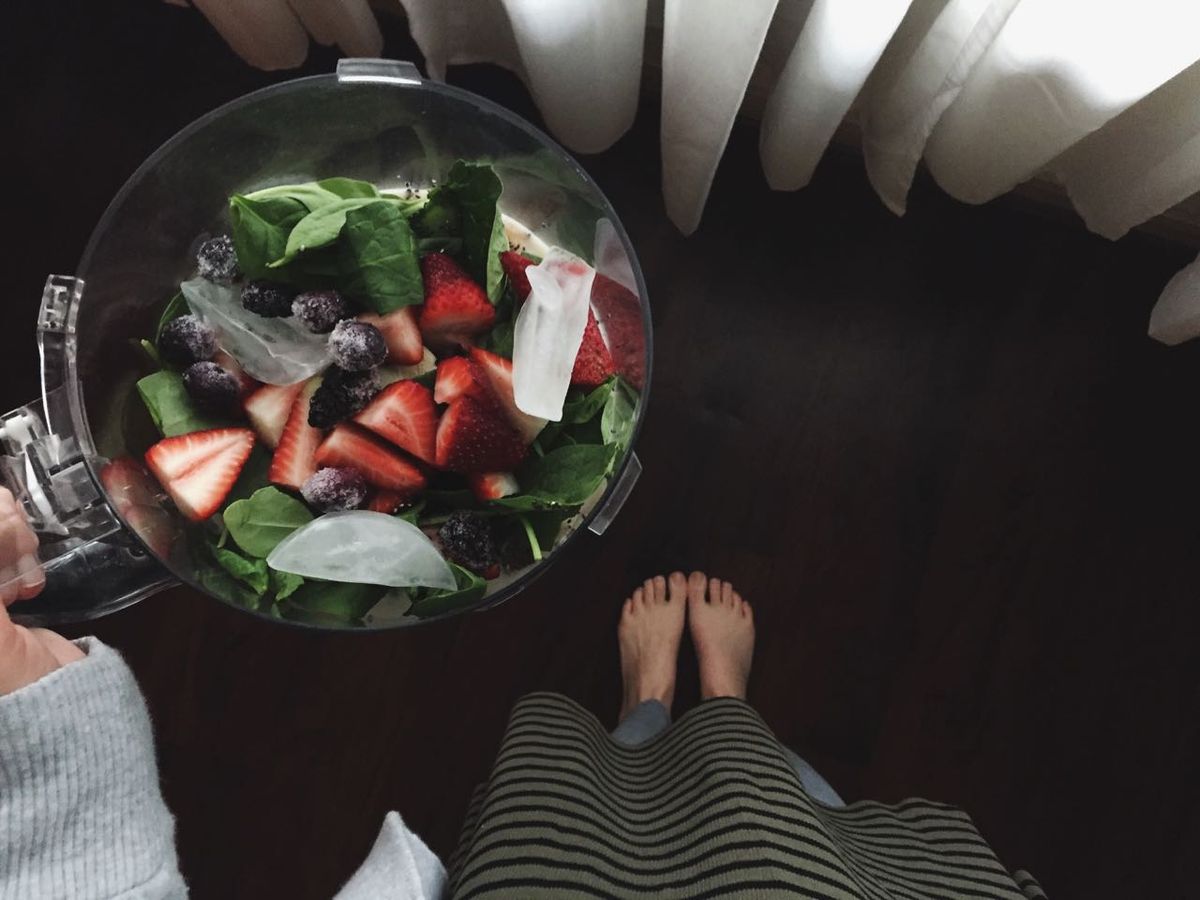 Add all ingredients to blender, food processor, etc. and pulse until smooth. The final product will be somewhere on the color spectrum of purple to green, depending on how generous your berry incorporation is. Enjoy! I love to drink mine out of a big jar.