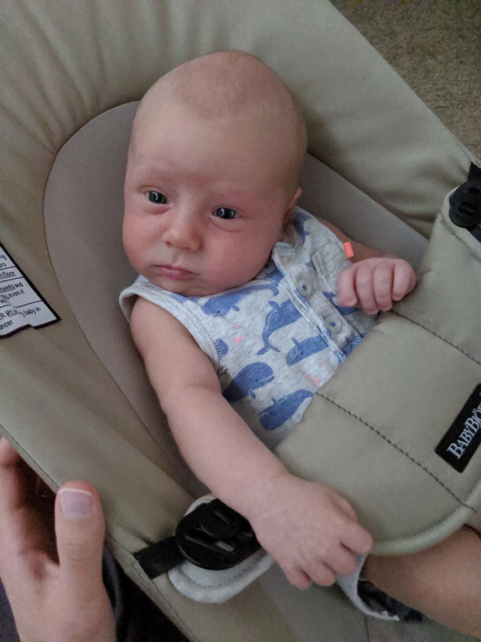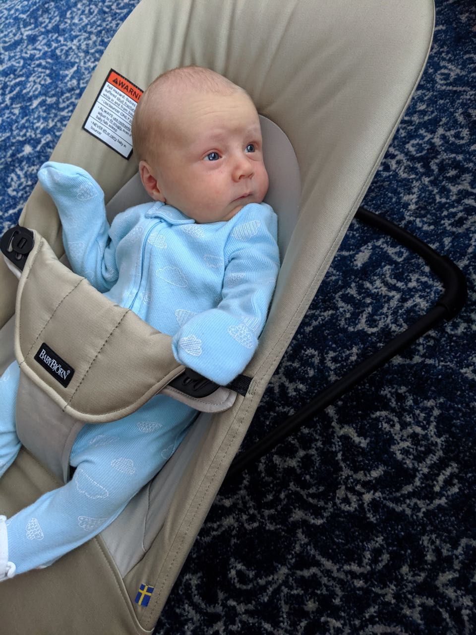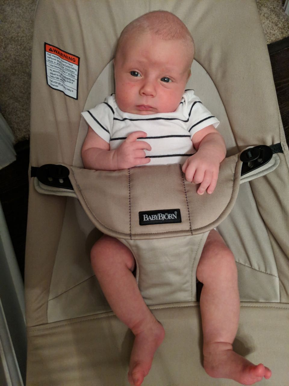 Snuggle Me Organic—Since it gives him the sense that he's being held, this is a great spot to set him down if mom and dad need free hands, especially when he's sleepy. At almost five weeks old, he still likes it, but we find he's not a fan when he's awake/alert, since he can't look around. But it's still a great place to set him when he's sleepy.