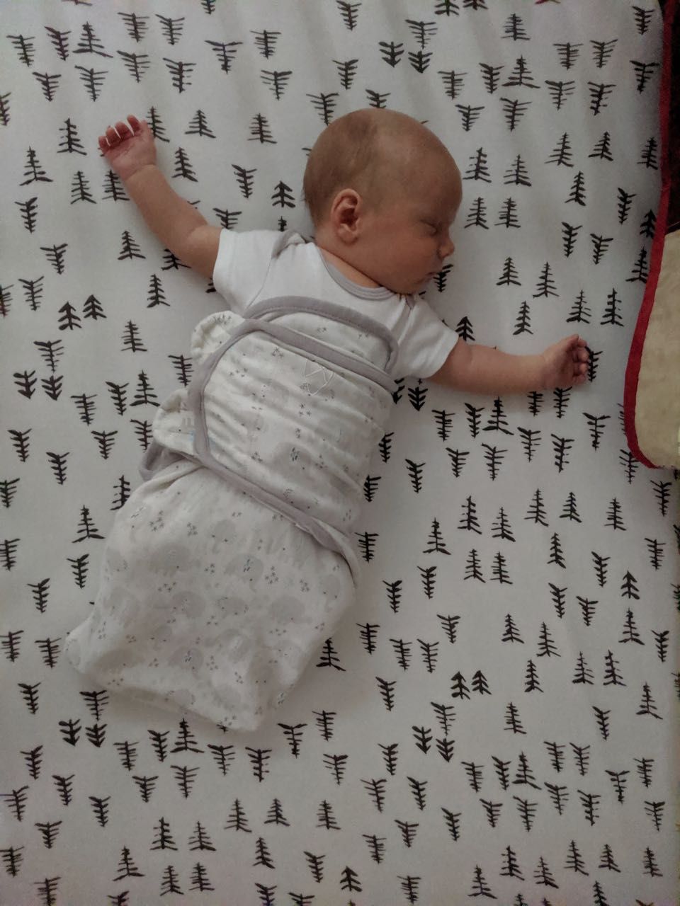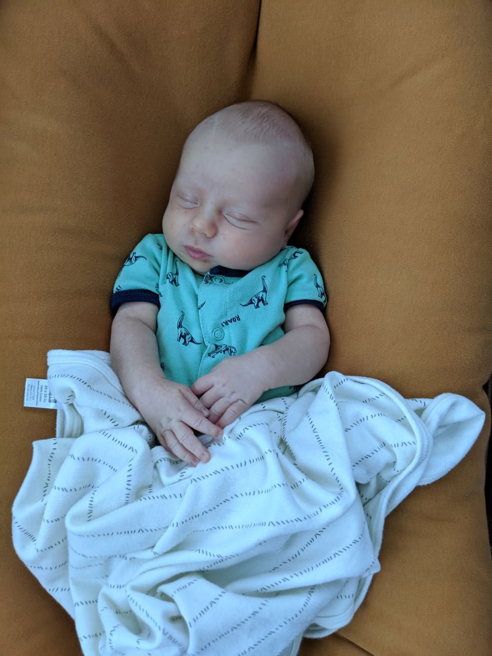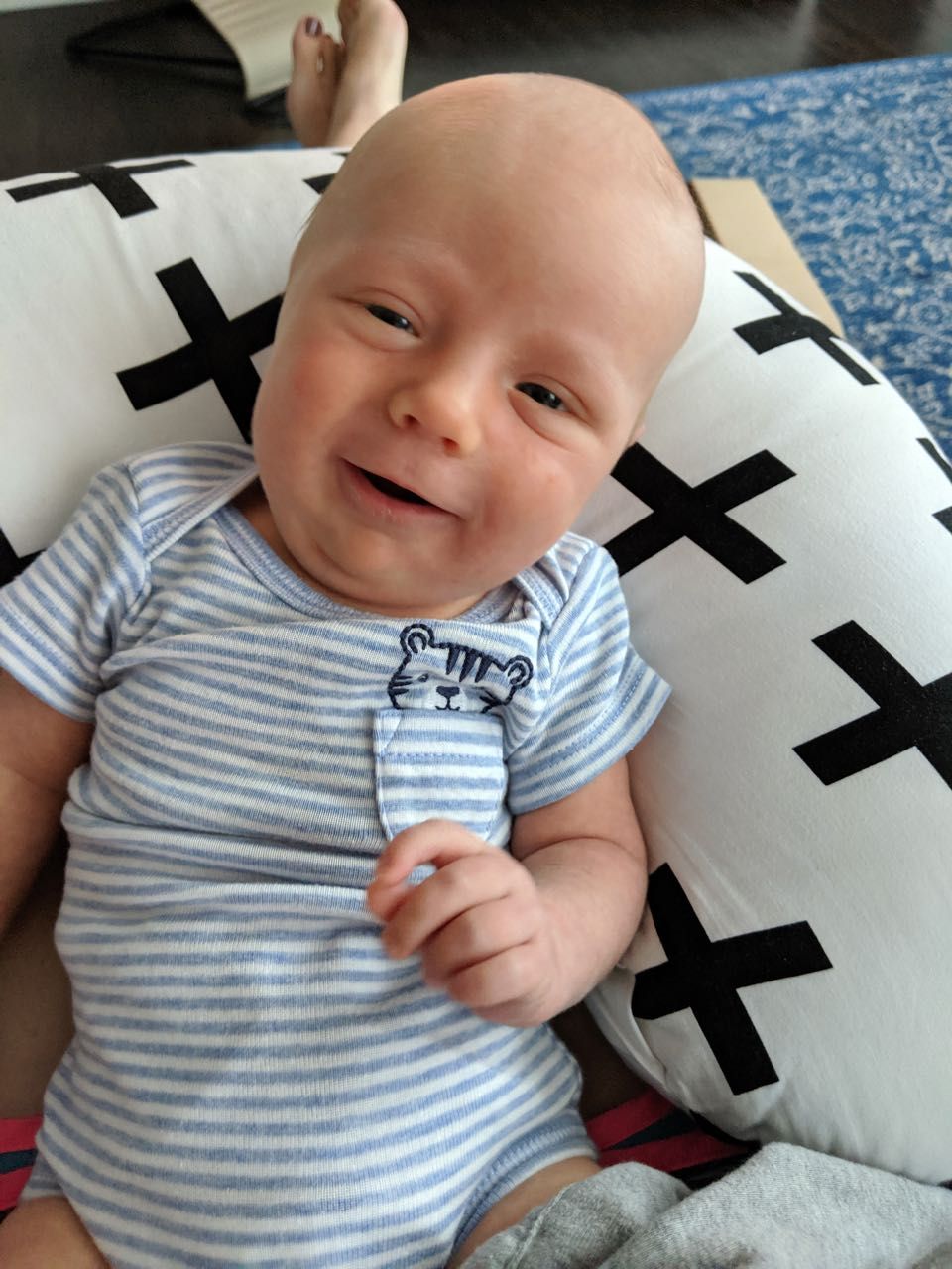 Snuggle Me Organic—Since it gives him the sense that he's being held, this is a great spot to set him down if mom and dad need free hands, especially when he's sleepy. At almost five weeks old, he still likes it, but we find he's not a fan when he's awake/alert, since he can't look around. But it's still a great place to set him when he's sleepy.