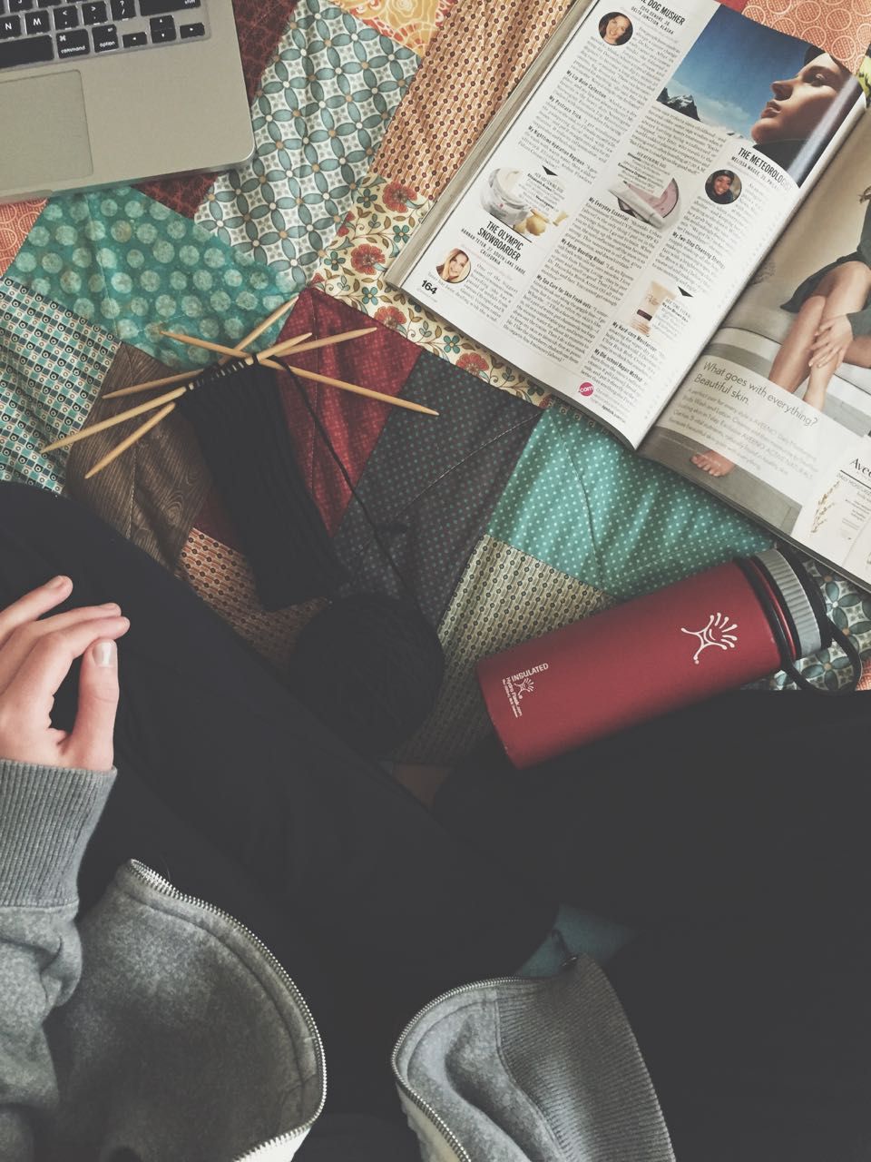 Now that I'm winding down to take my pre-work afternoon nap soon, I'm knitting, magazine-reading, and water-drinking: