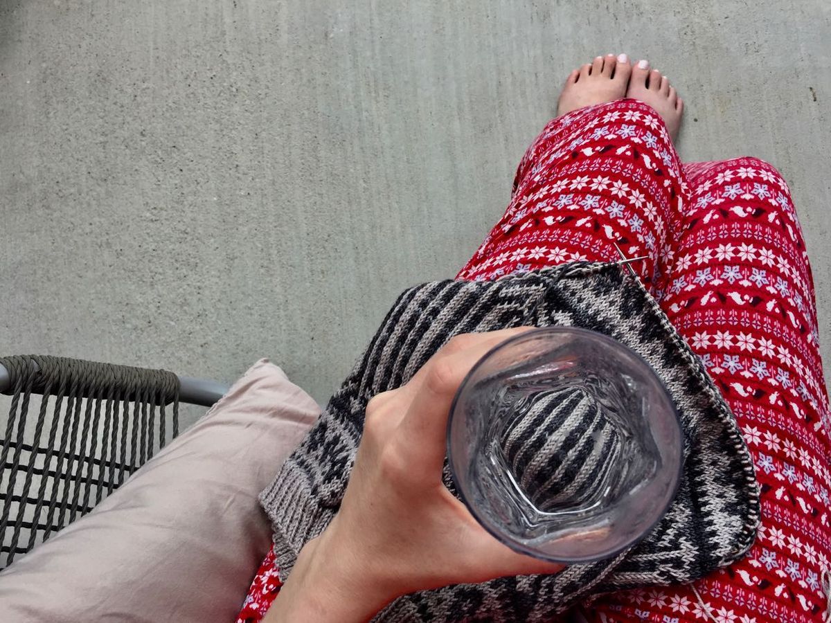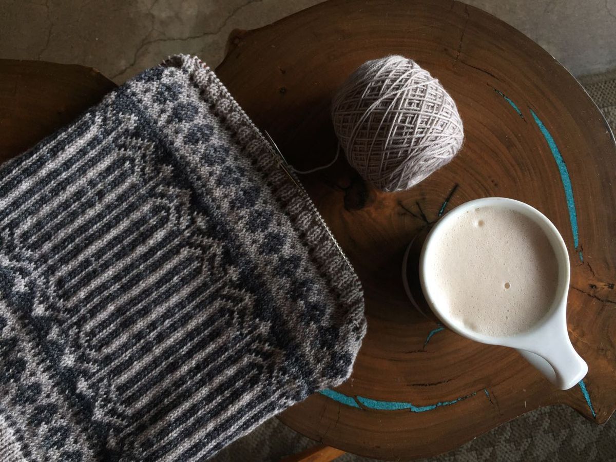 Nicholas and I were both off on Labor day, but I woke up really sick, with GI/flu/fever/chills and all the symptoms you don't wish on anyone. I slept most of the day, but in the afternoon, thinking that some fresh air would do me good, we stepped out on the porch, him with his coffee, me with my water, to sit out there, talk, and watch the rain. And I knit a few rows on his Christmas gift cowl, which is almost finished!
