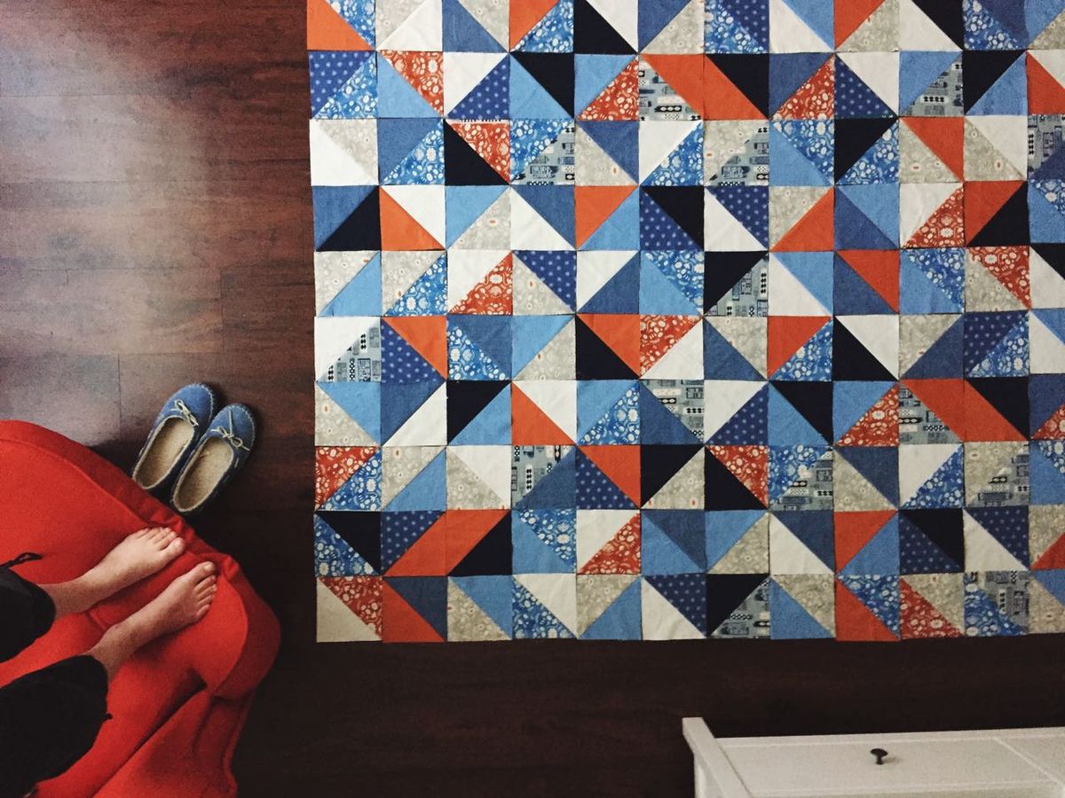 I'm sewing a quilt!! It's really happening! Some things I'm learning: in general, how not to be afraid of my sewing machine. But specifically how to adjust tension and raise and lower the feed teeth and how to avoid stretching fabrics on the bias so they become distorted. At this point, I've sewn together 184 half square triangles and decided upon a final layout. Next step? Sewing the squares into strips. It's quite slow and methodical, but I love the rhythm of it, and all those short, straight seams are definitely building my confidence with the machine (although you can see the instructions booklet opened, at-the-ready, in the frame below ;)
