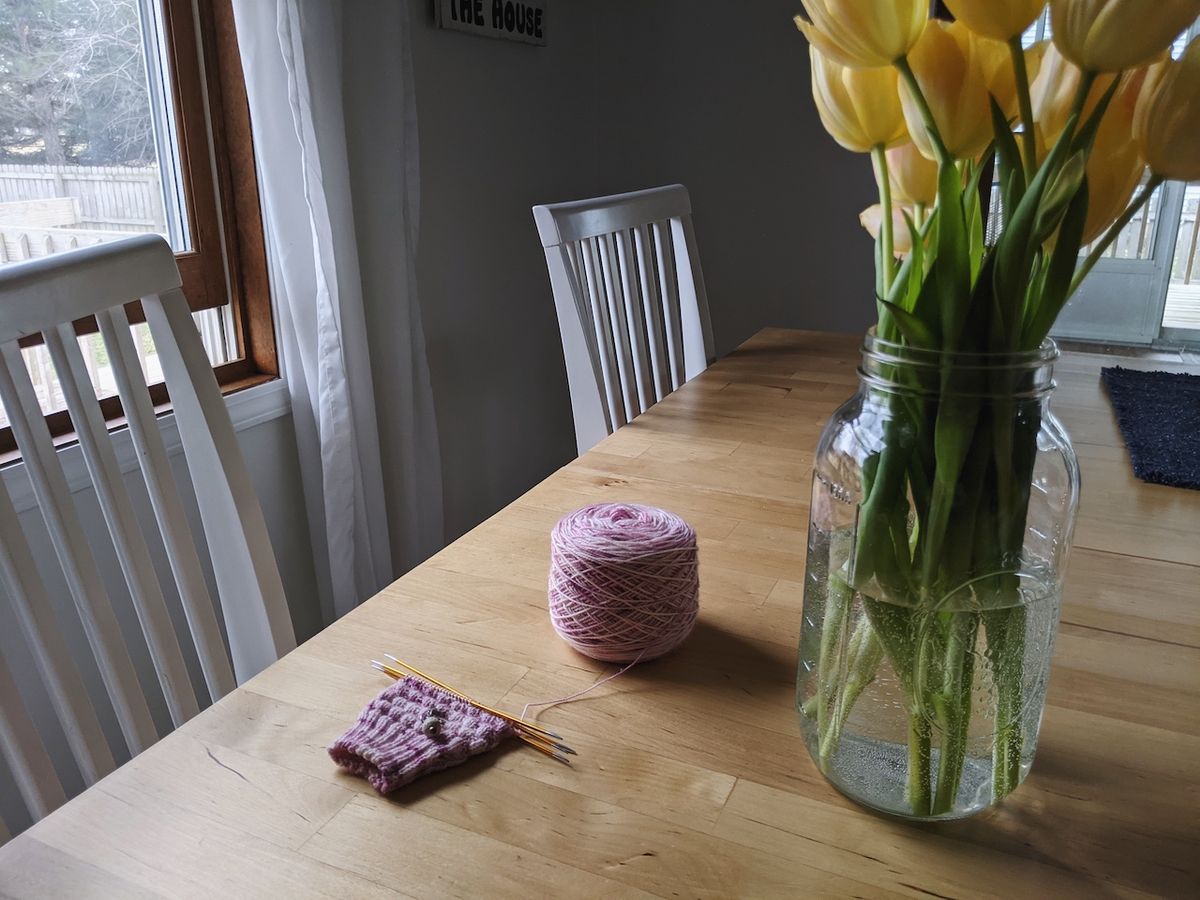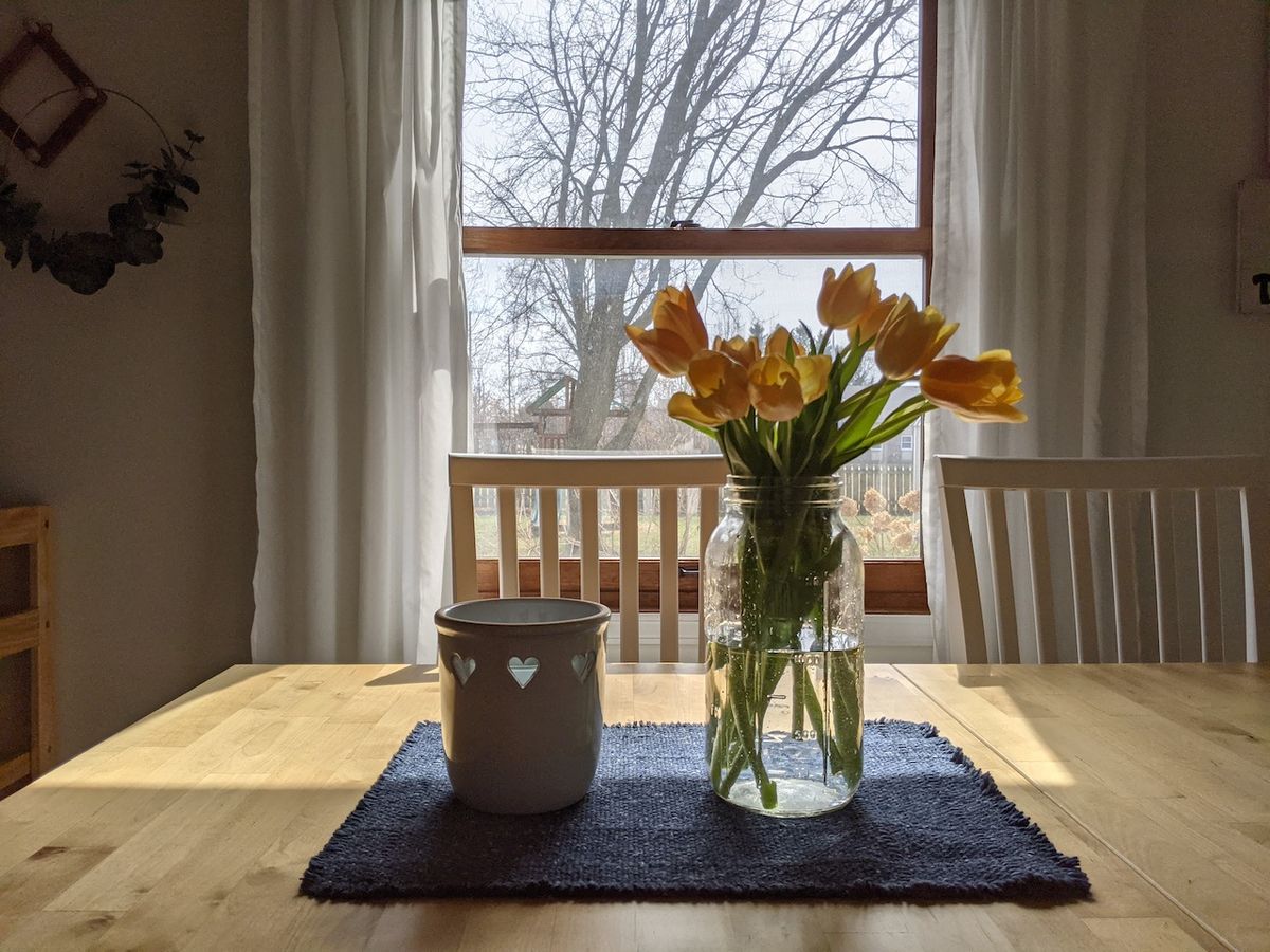 I bought yellow tulips at the store. Brightens the room and my mood. I just love tulip season.