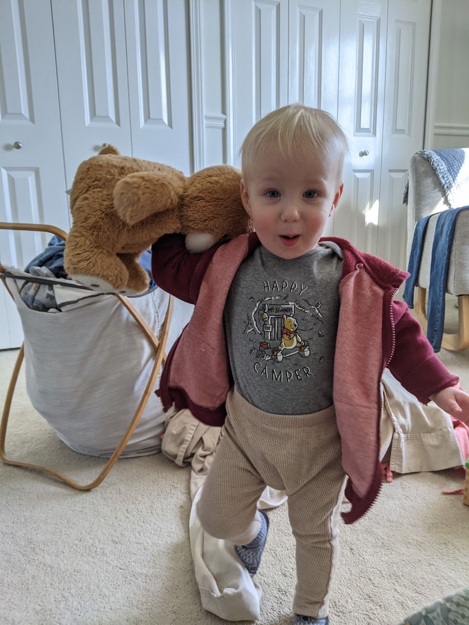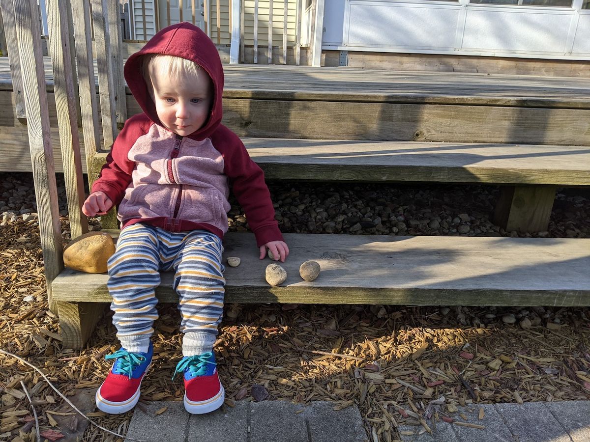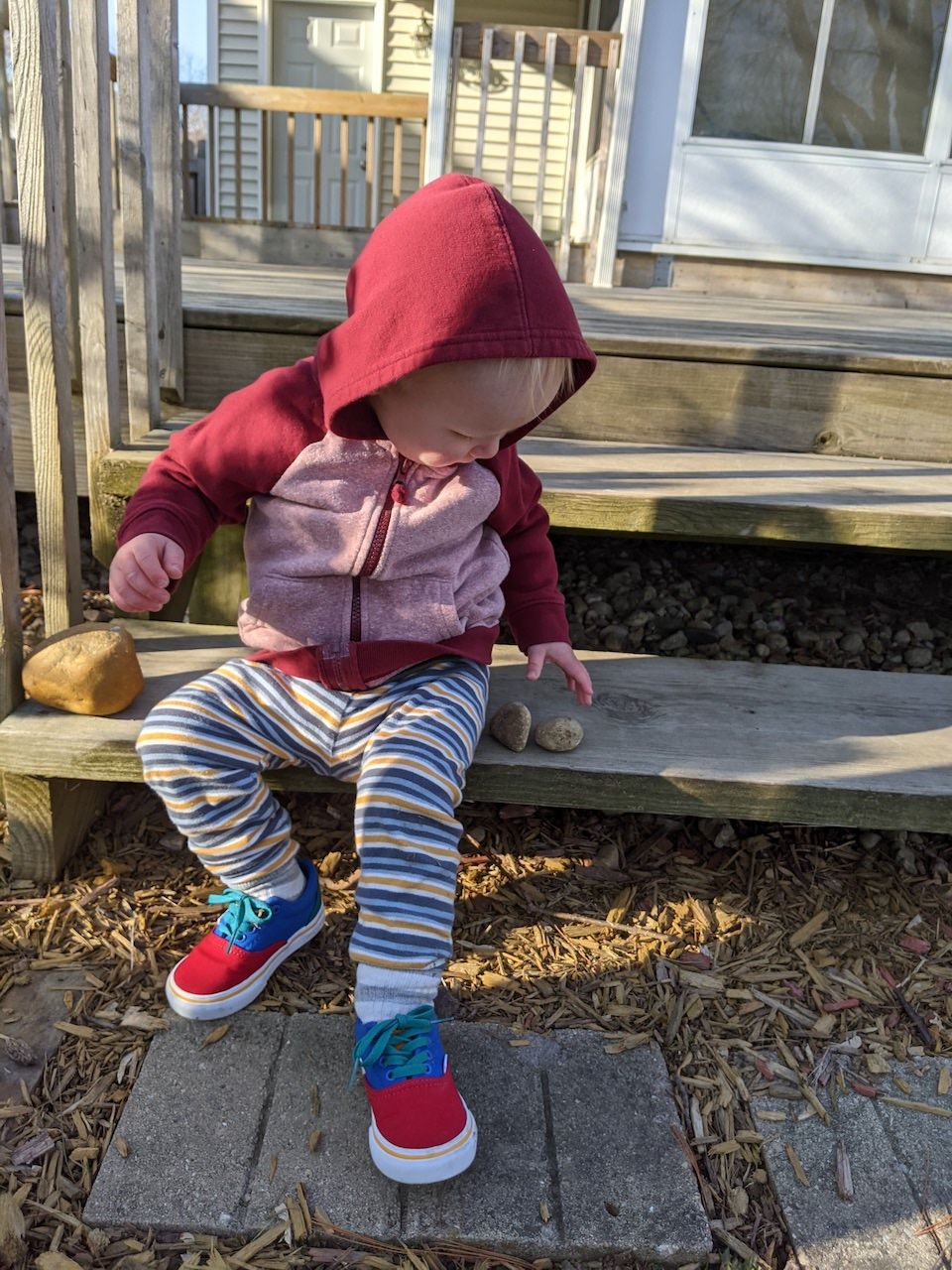 And Cooper has been busy reciting animal sounds, watching birds (and a bunny) out the patio window, hugging his stuffed bears, scouting for the most hold-able rocks in the backyard. He can now climb up the ladder on our playset and go down the slide by himself(!) He helps me add smoothie ingredients to the smoothie cup, and can hold a hand mixer all by himself (all of this with supervision, of course, of course). He strongly favors his red hoodie and his multi-colored mini Vans. He gives us hugs and kisses, tries and very much succeeds at making us laugh. Tonight, he carried two bowls very carefully into the living room, then went back in the kitchen and returned with a spoon. He served us imaginary "soup," and tasted it himself. He holds our hands on walks. He says "Ahhhh," after drinking water. And he loves trucks and vehicles of any kind, the bigger the better. He gives us big hugs and makes me melt into a puddle most days. He is a joy.
