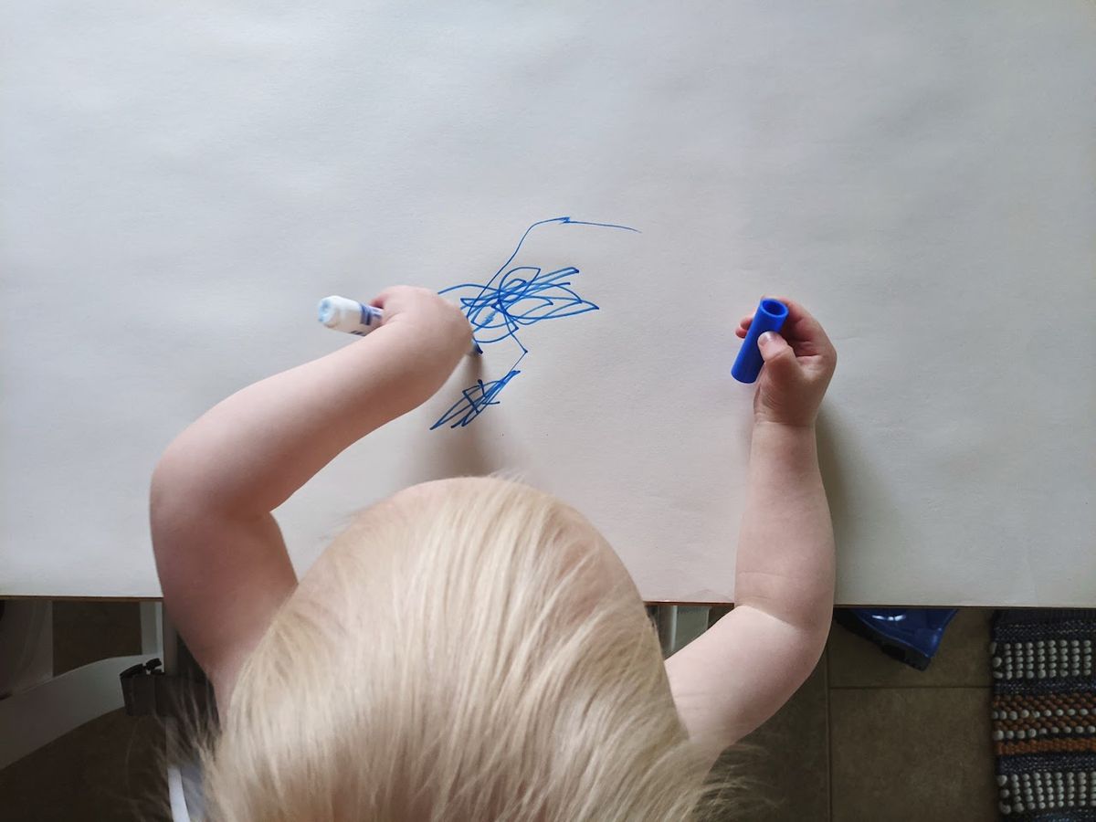 Coloring time with markers. He carefully recapped each one, and he also drew blue marker all over his belly (that's balance, right? ;)