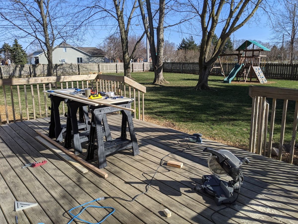 Nicholas spent much of the past weekend building a built-in desk for the basement. He did the assembly, routing, sanding, etc. And I've done most of the painting. And Coop and I watched a lot of the process through the screen on the three-season porch.