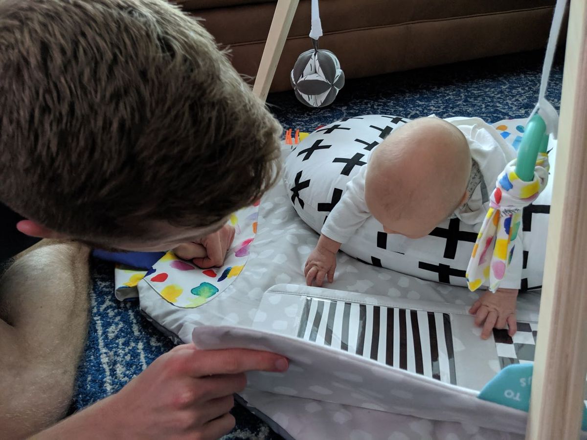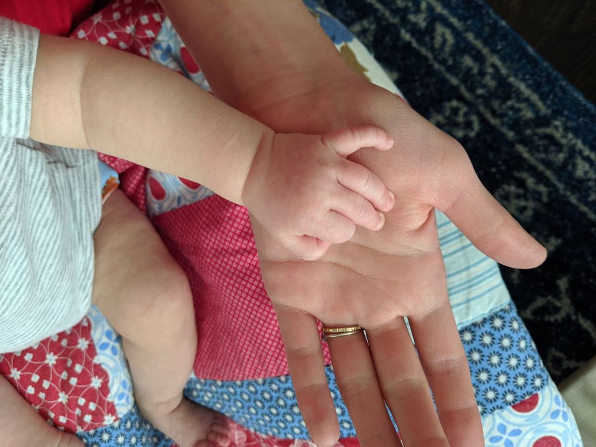 - Still reaching for daddy's beard and opening and closing his fingers to try to feel textures