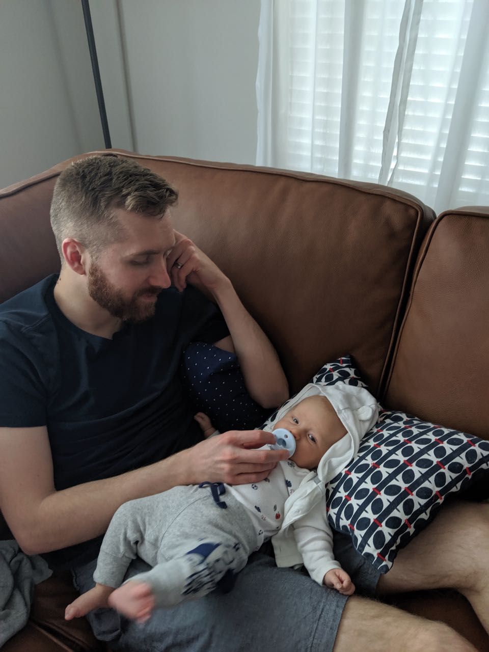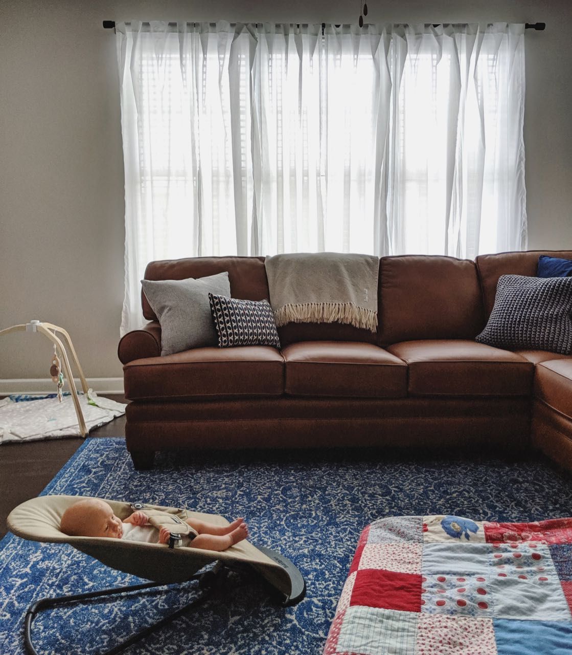- Enjoying sitting in the BabyBjorn bouncer while mama eats most meals on the rug, next to him