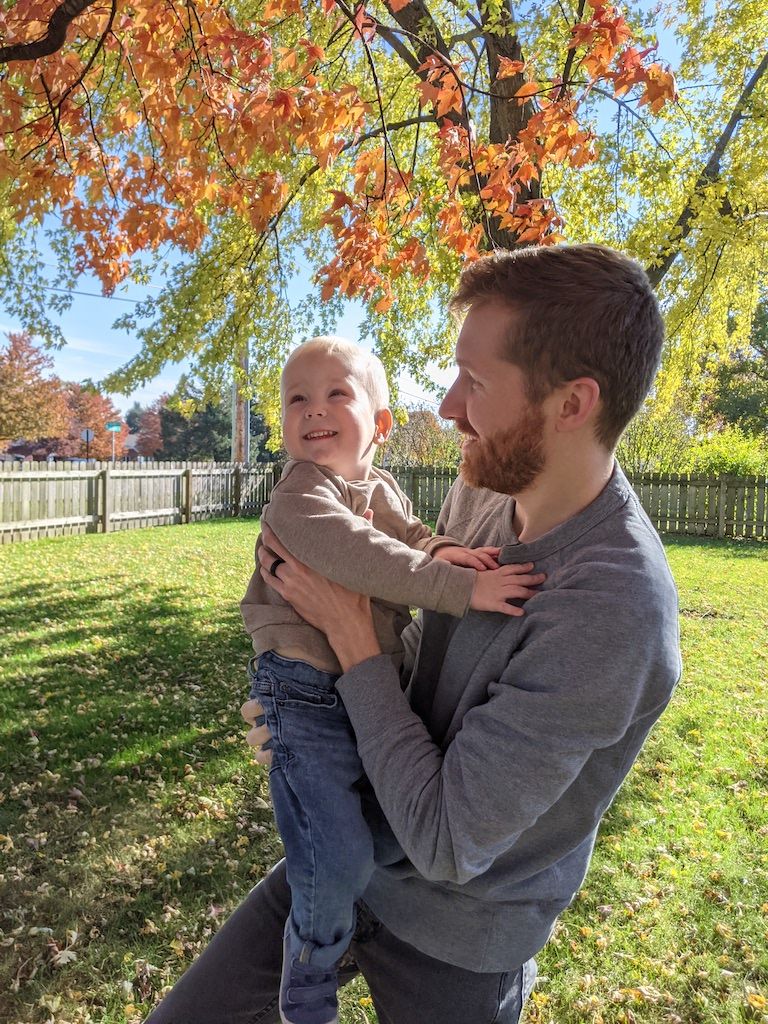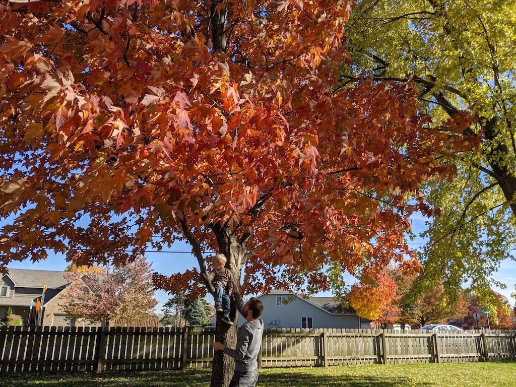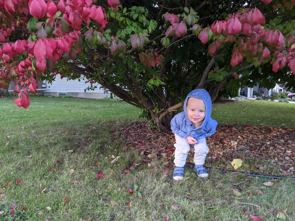 Helping daddy rake leaves, thrilled to have his own rake to use. Picking "blueberries" off our burning bush, and pointing out, "other burning bushes" near grandma and grandpa's house. He notices everything.