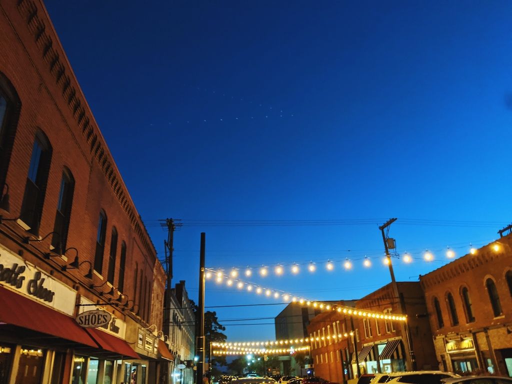 "Walking under lights" on one of our downtown streets with strung lights: Cooper's favorite.