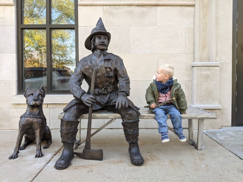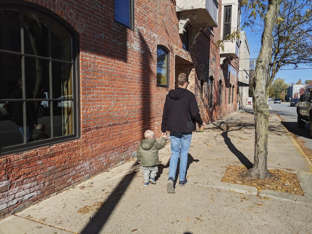 Family dates downtown, and Cooper's first experience of hot cocoa (hot cacao, made with cacao powder + coconut milk + coconut sugar from one of our favorite local shops). We walked around, him between us, wanting to hold "both hands," one each of our hands. Showing him the ice rink, now flooded, bright maple trees aglow, and the crews adding lights to the trees.