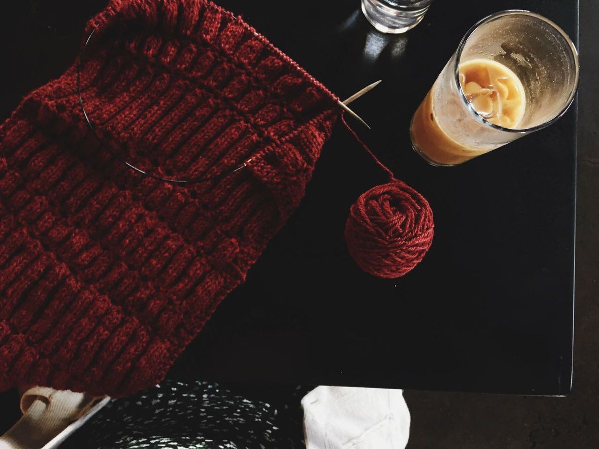 - Our Tuesday routine: Coffee shop knitting while he's at a work meeting. It's iced latte season (but it usually is, here in Austin).