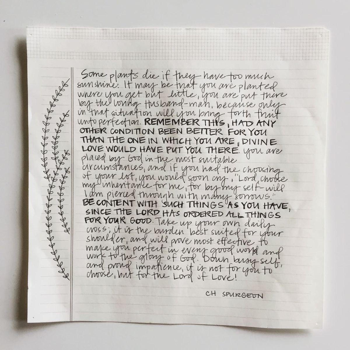 (below) I wrote out this Charles Spurgeon quote a few years ago when I was a college student, and it's moved with me from bulletin board to refrigerator, Indiana to Texas, but today I saw it with fresh eyes. Spurgeon is referring to big things, but truths about big things so frequently apply to little things too.