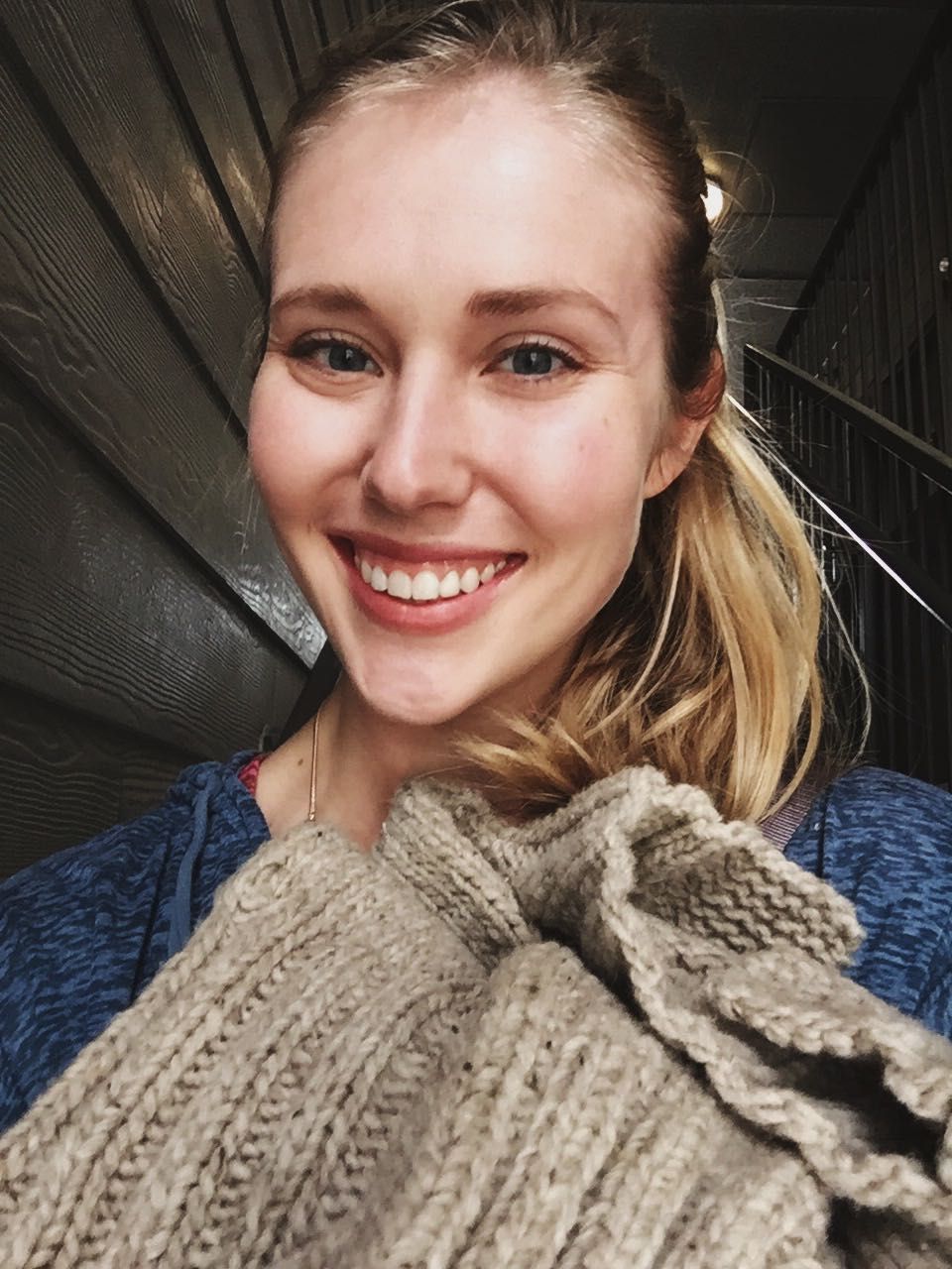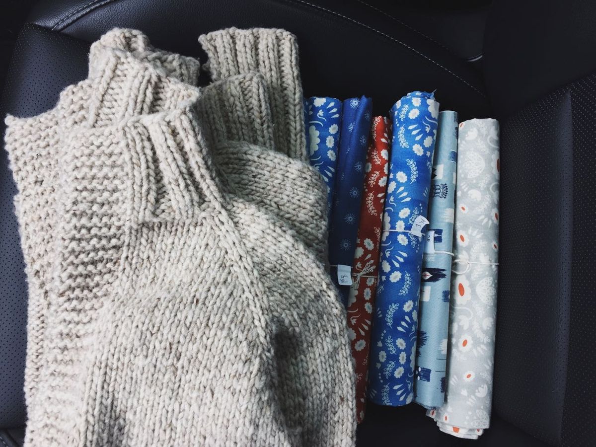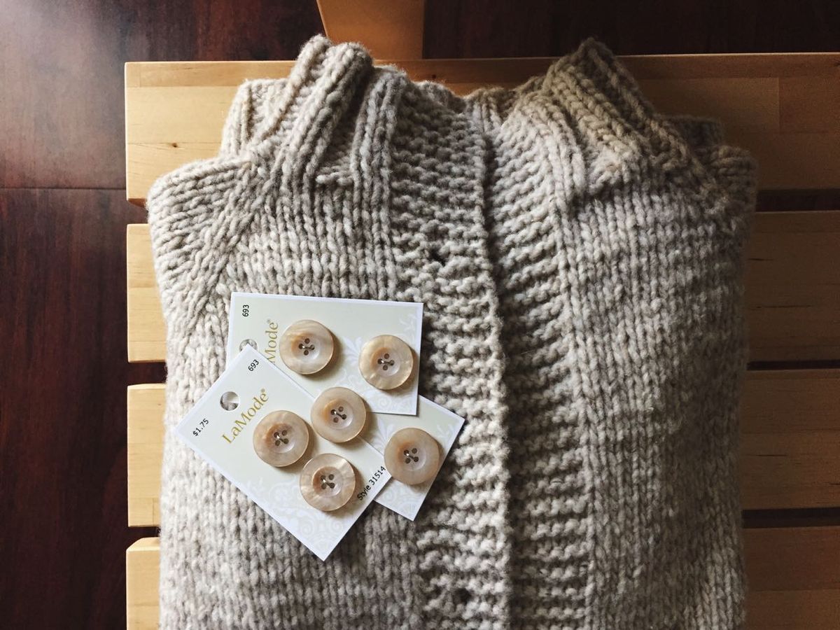 Visiting multiple stores for just the right buttons for my Arctic cardigan. By the way, it's done! Post to come soon, but here's a little snapshot of me wearing it (pre-buttons).