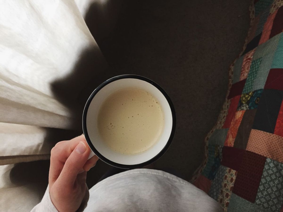 Drinking butter coffee at home(!) using "butter bombs" from our local farmer's market + a whirl with the immersion blender